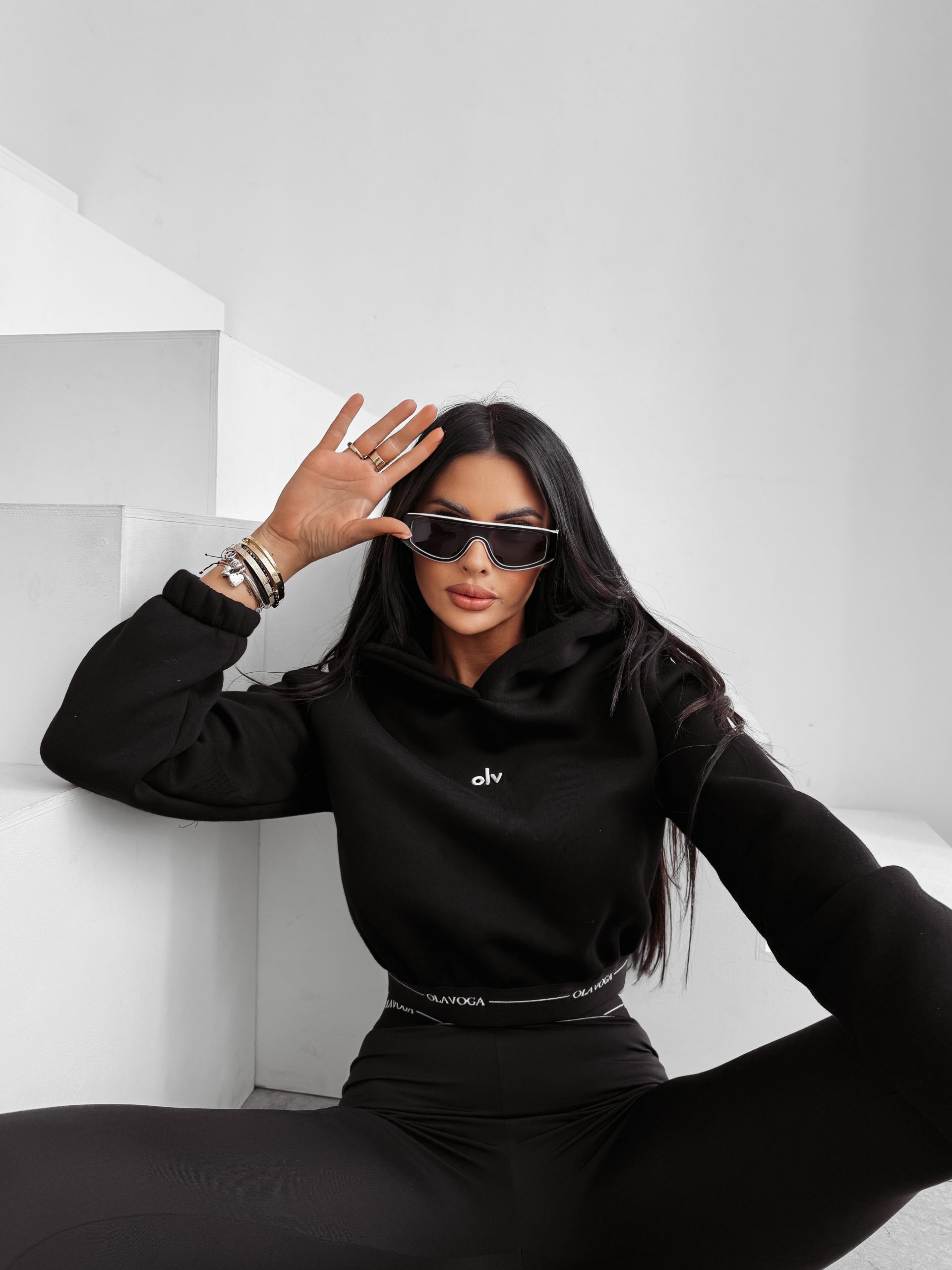 Sportowa bluza z kapturem, o krótszym kroju. Wykonana z wysokiej jakości wysokogatunkowej bawełny. Logowana guma w pasie. Na przodzie minimalistyczny, kontrastujący haft OLV. Tworzy idealny komplet z legginsami LUNARI.