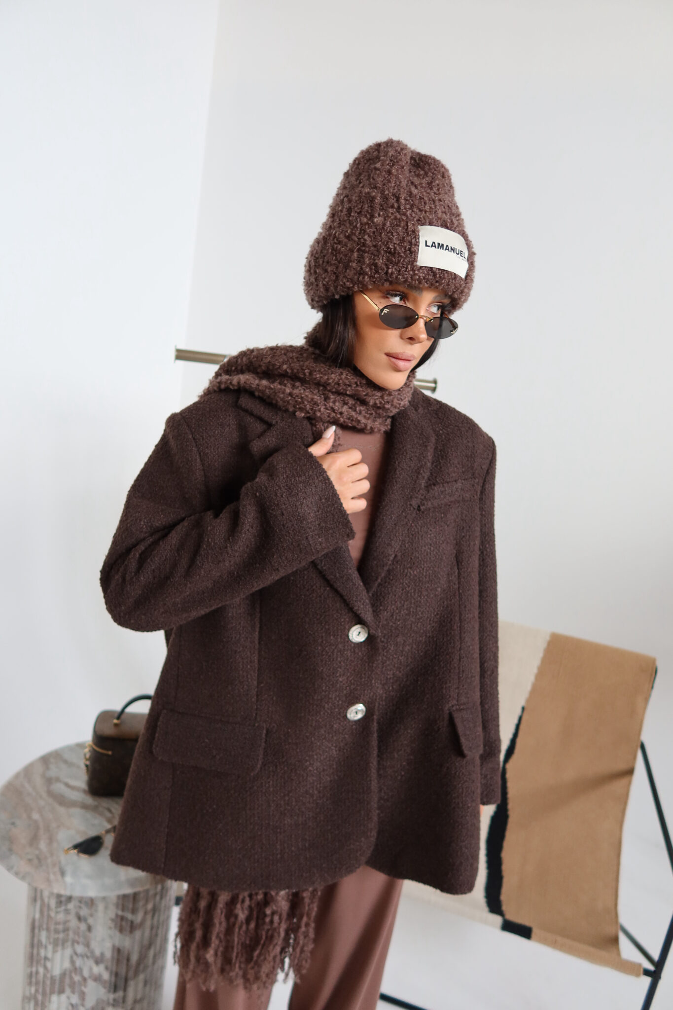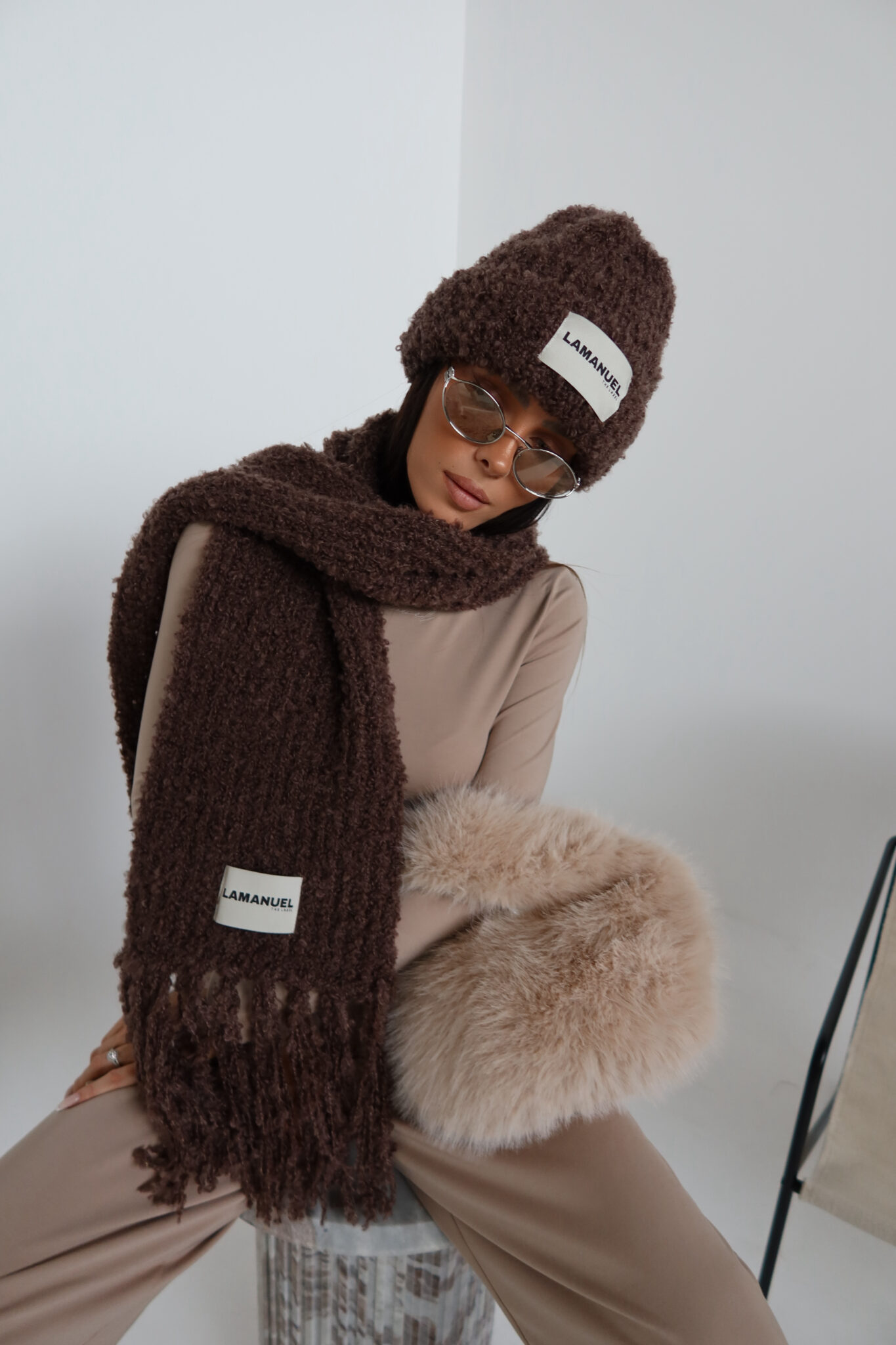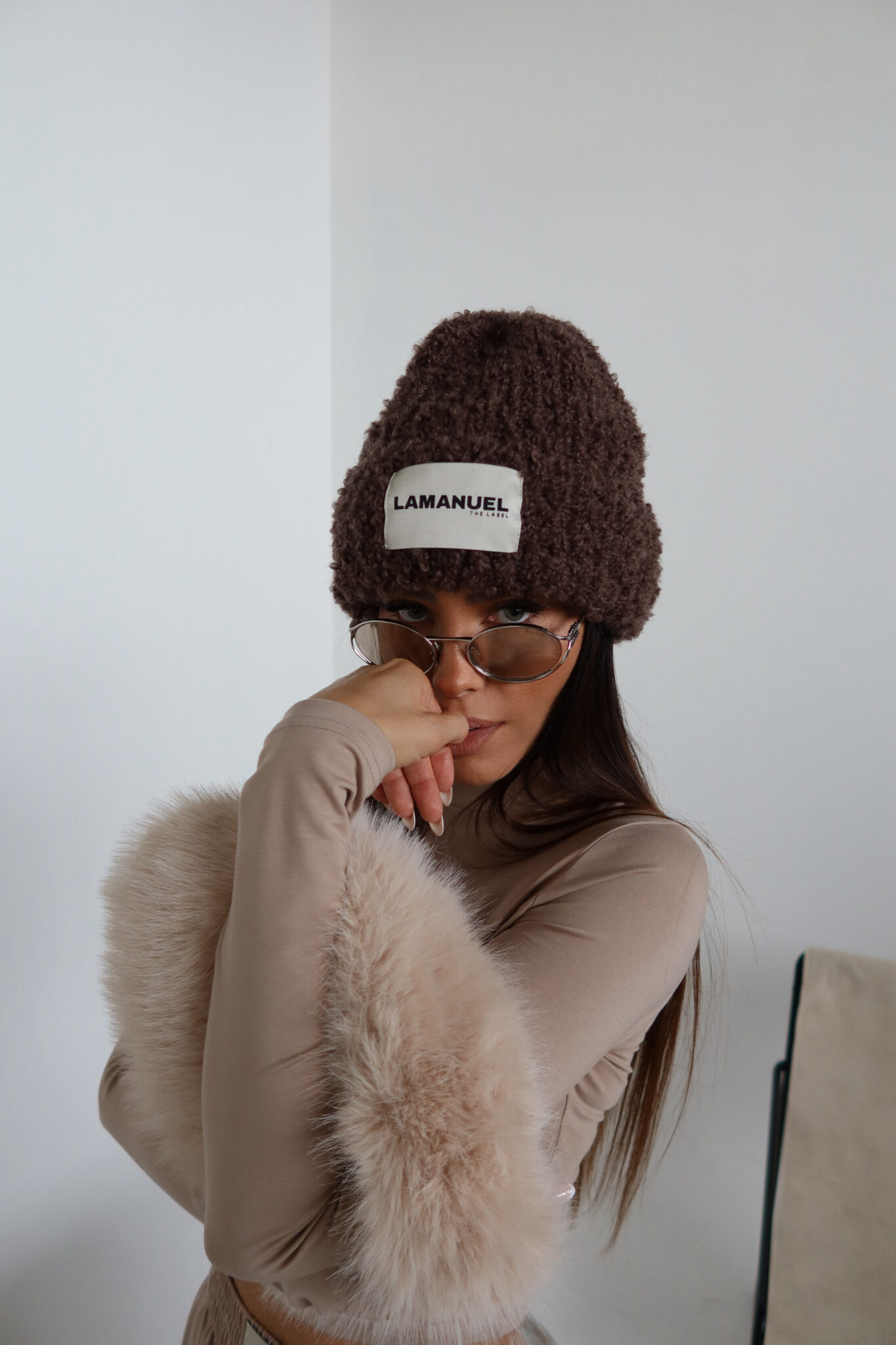 Gruba, ciepła czapka z fakturą boucle i dużą naszywką z logo LAMANUEL. Elastyczna i miękka – idealnie dopasowuje się do głowy. Stylowy must-have na chłodniejsze dni.Skład: 38% akryl 25% moher 20% wełna 17% poliamid