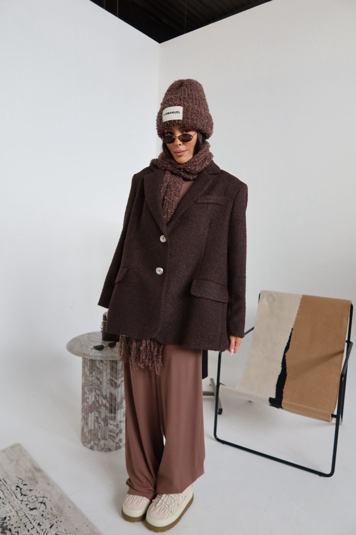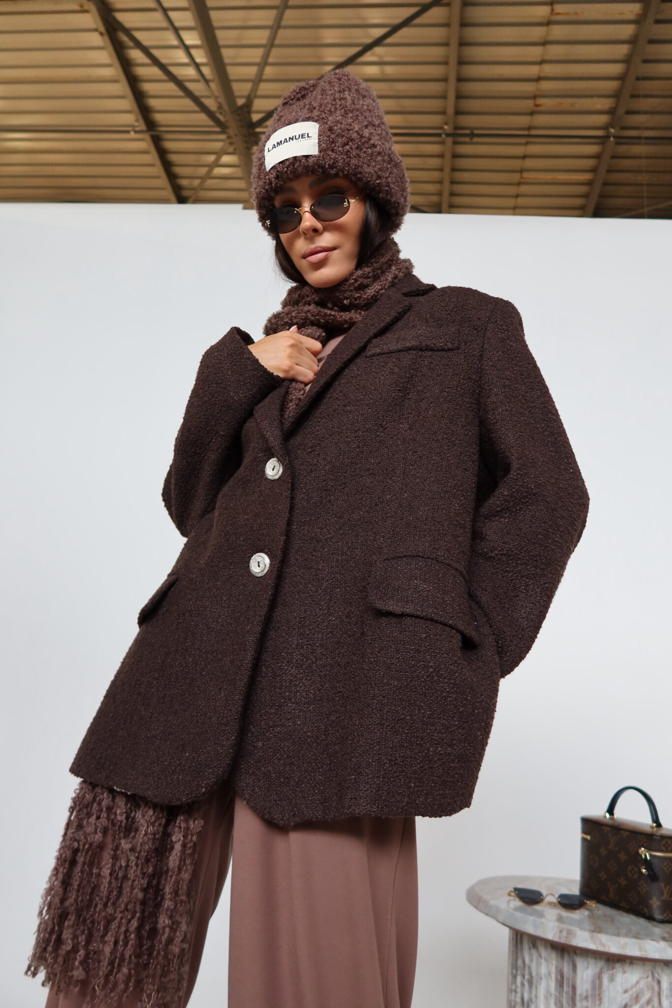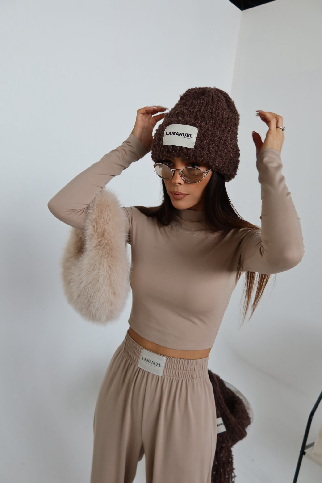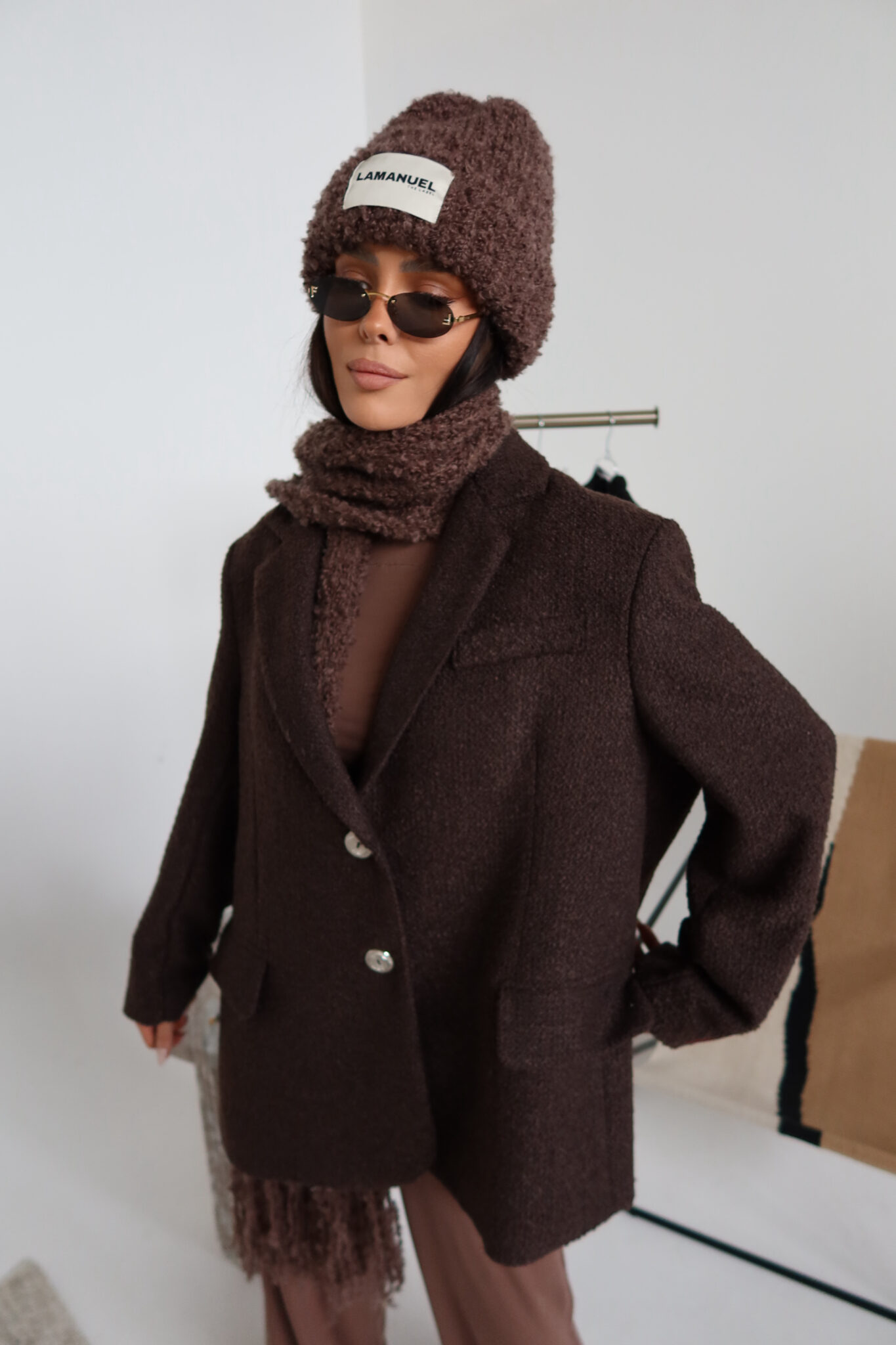 Gruba, ciepła czapka z fakturą boucle i dużą naszywką z logo LAMANUEL. Elastyczna i miękka – idealnie dopasowuje się do głowy. Stylowy must-have na chłodniejsze dni.Skład: 38% akryl 25% moher 20% wełna 17% poliamid