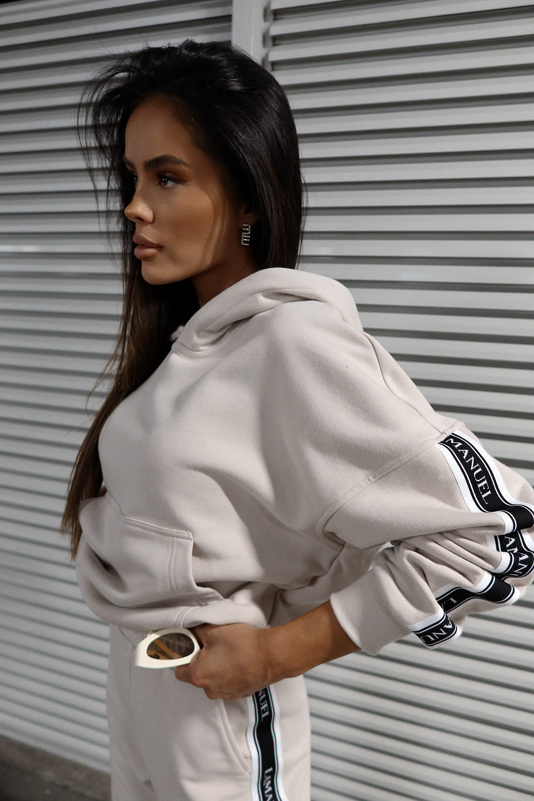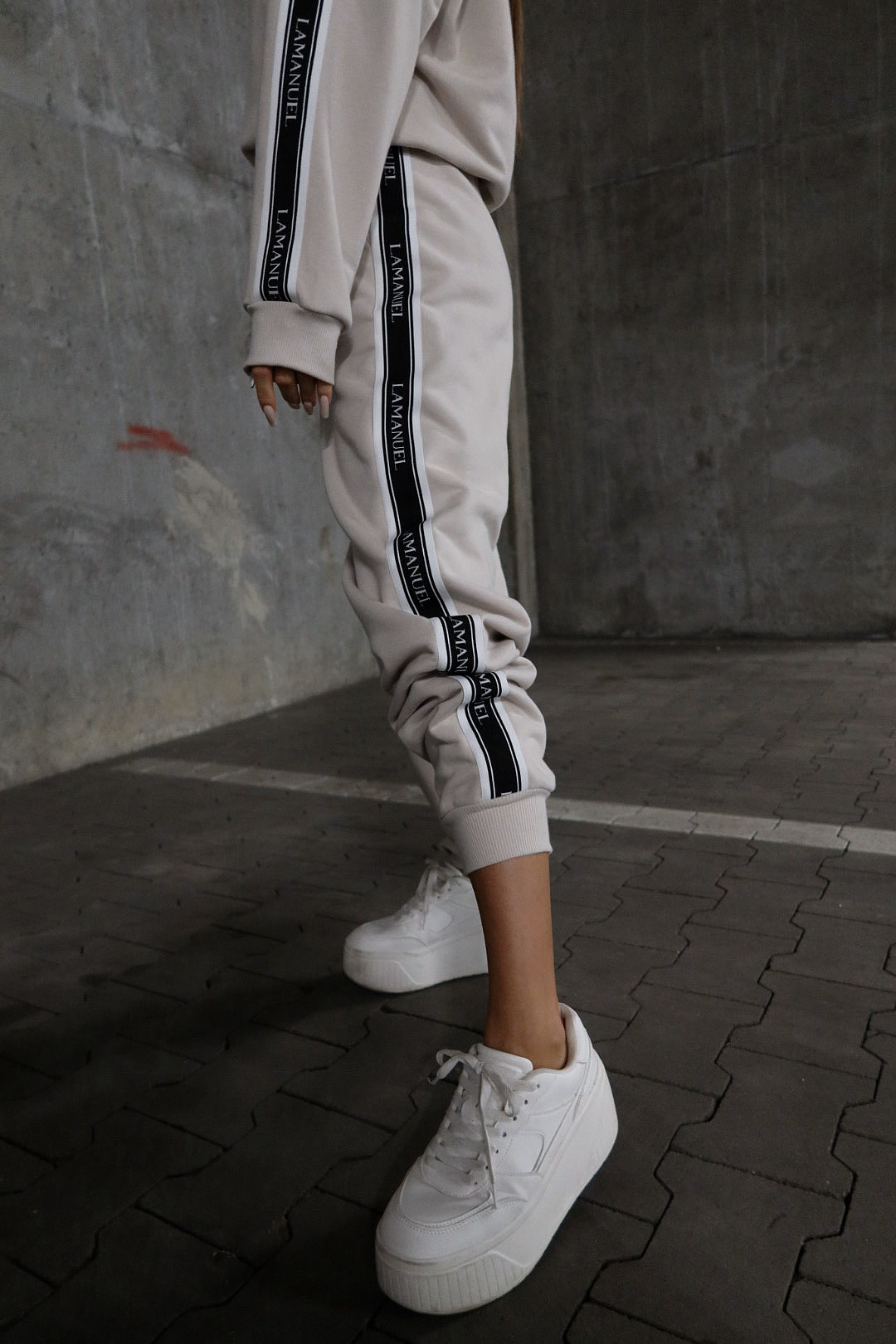 Bluza wykonana z dzianiny dresowej pętelkowej, o klasycznym, lekko oversize’owym kroju. Model z kapturem i kieszenią typu kangurka, ozdobiony szerokimi lampasami z logo LAMANUEL wszytymi wzdłuż rękawów. Ściągacze przy mankietach i dole zapewniają wygodne dopasowanie. Idealna propozycja na codzienne, swobodne stylizacje – zarówno w zestawie, jak i solo.Spodnie z dzianiny dresowej pętelkowej, o swobodnym kroju z wyższym stanem. Elastyczny pas oraz nogawki zakończone ściągaczem zapewniają komfort i dopasowanie. Szerokie lampasy z logo LAMANUEL wzdłuż nogawek podkreślają charakter modelu. Boczne kieszenie zwiększają funkcjonalność. Spodnie świetnie sprawdzą się w duecie z bluzą lub jako element miejskiej stylizacji.Skład: 90% bawełna 10% poliester