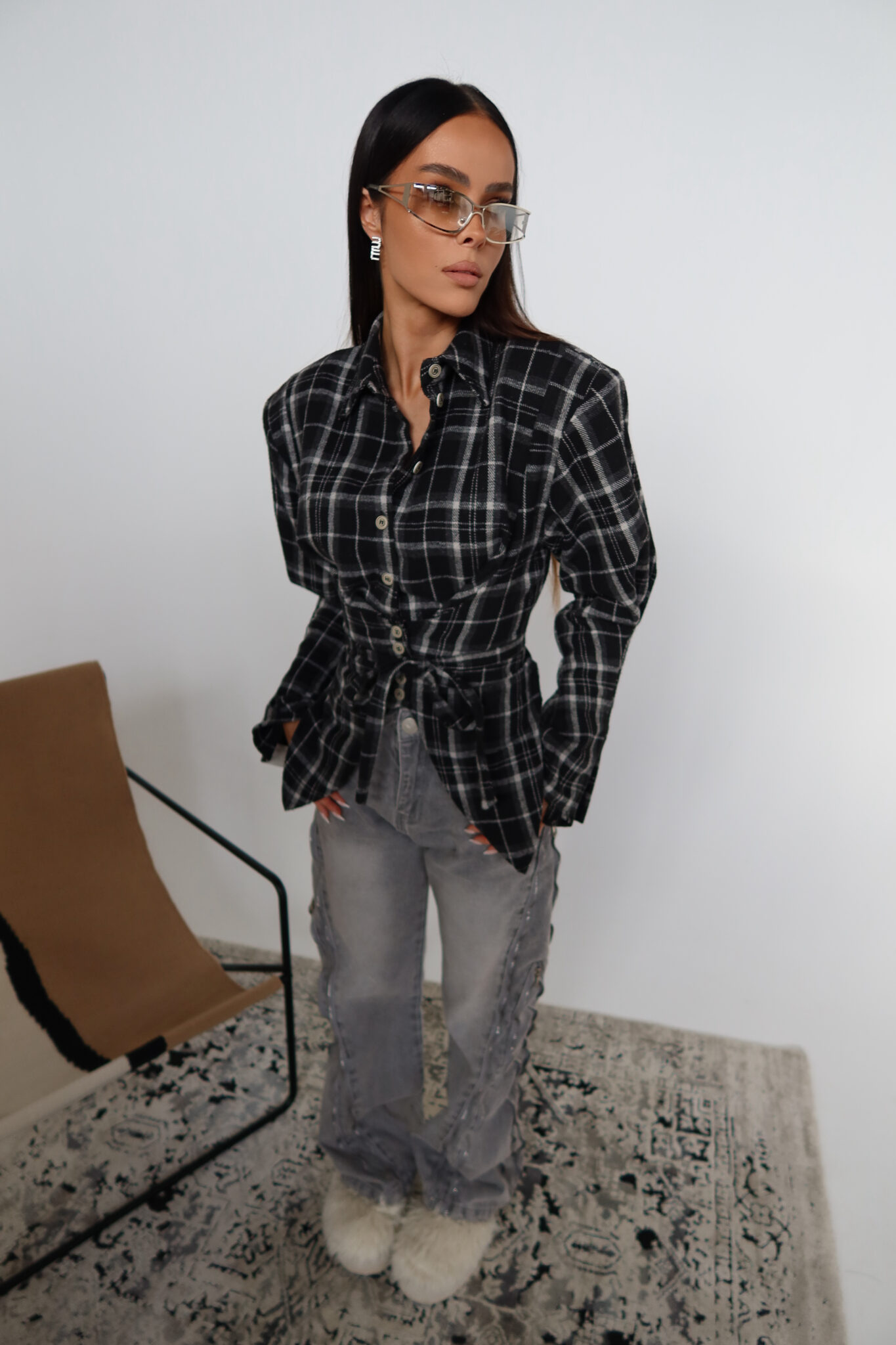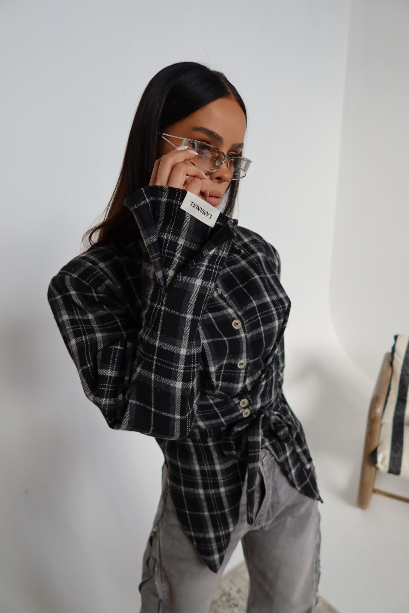 Koszula z wyraźnie zaznaczoną talią o kroju przypominającym gorset. Konstrukcja z poduszkami w ramionach podkreśla sylwetkę, a dopasowany dół pięknie ją modeluje. Z przodu klasyczne zapięcie na guziki, z tyłu wiązanie umożliwiające regulację dopasowania. Uszyta z miękkiej tkaniny w kratę – połączenie klasyki z nowoczesną formą.Skład: 50% bawełna 50% poliester