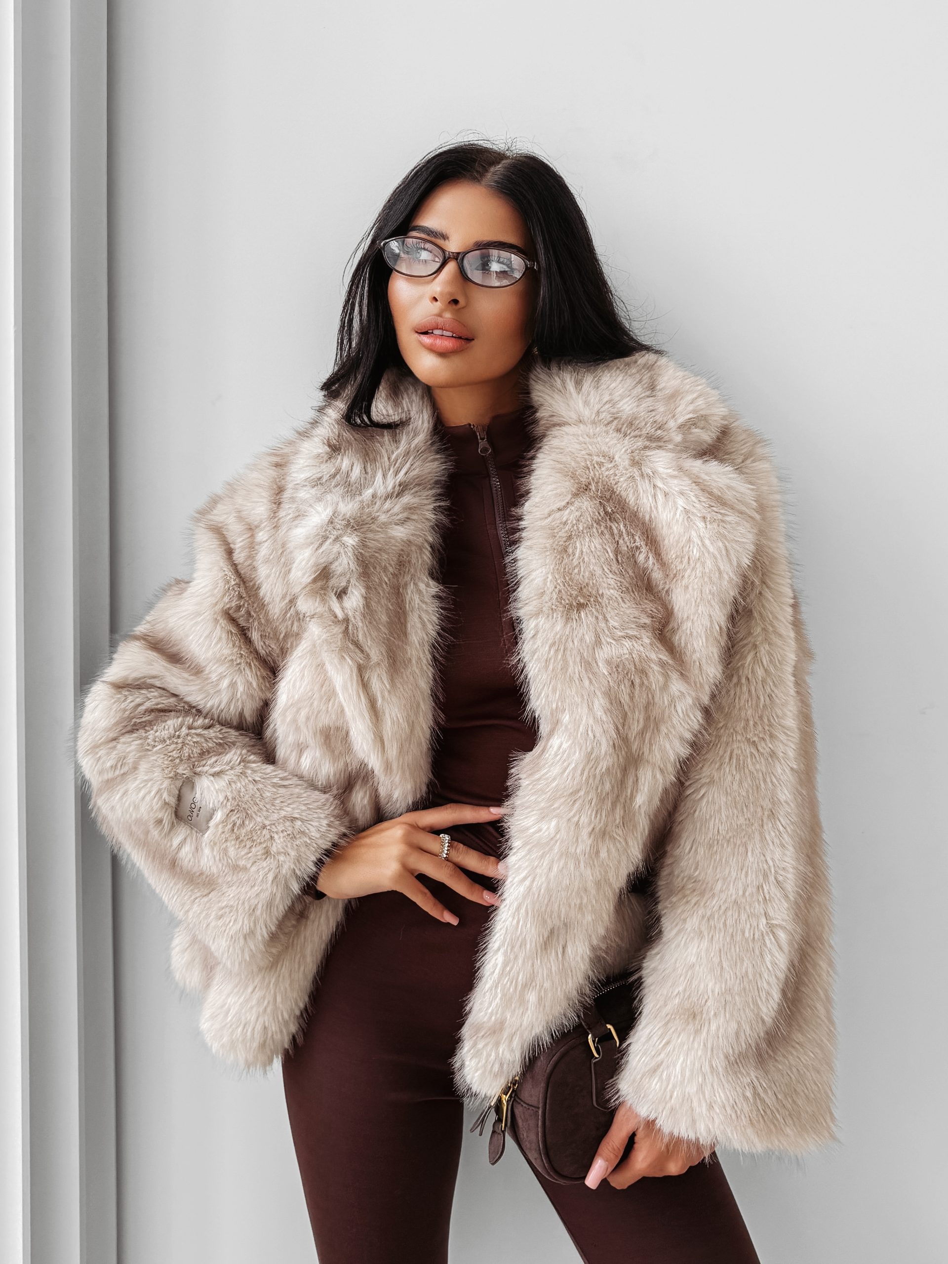 Casualowa kurtka damska wykonana z miękkiego, przyjemnego w dotyku sztucznego futra o gęstym włosiu. Krój lekko oversize z szerokim kołnierzem. Model zapinany na guziki, z bocznymi kieszeniami. Na rękawie naszywka z logo marki OLAVOGA EST. 2015.