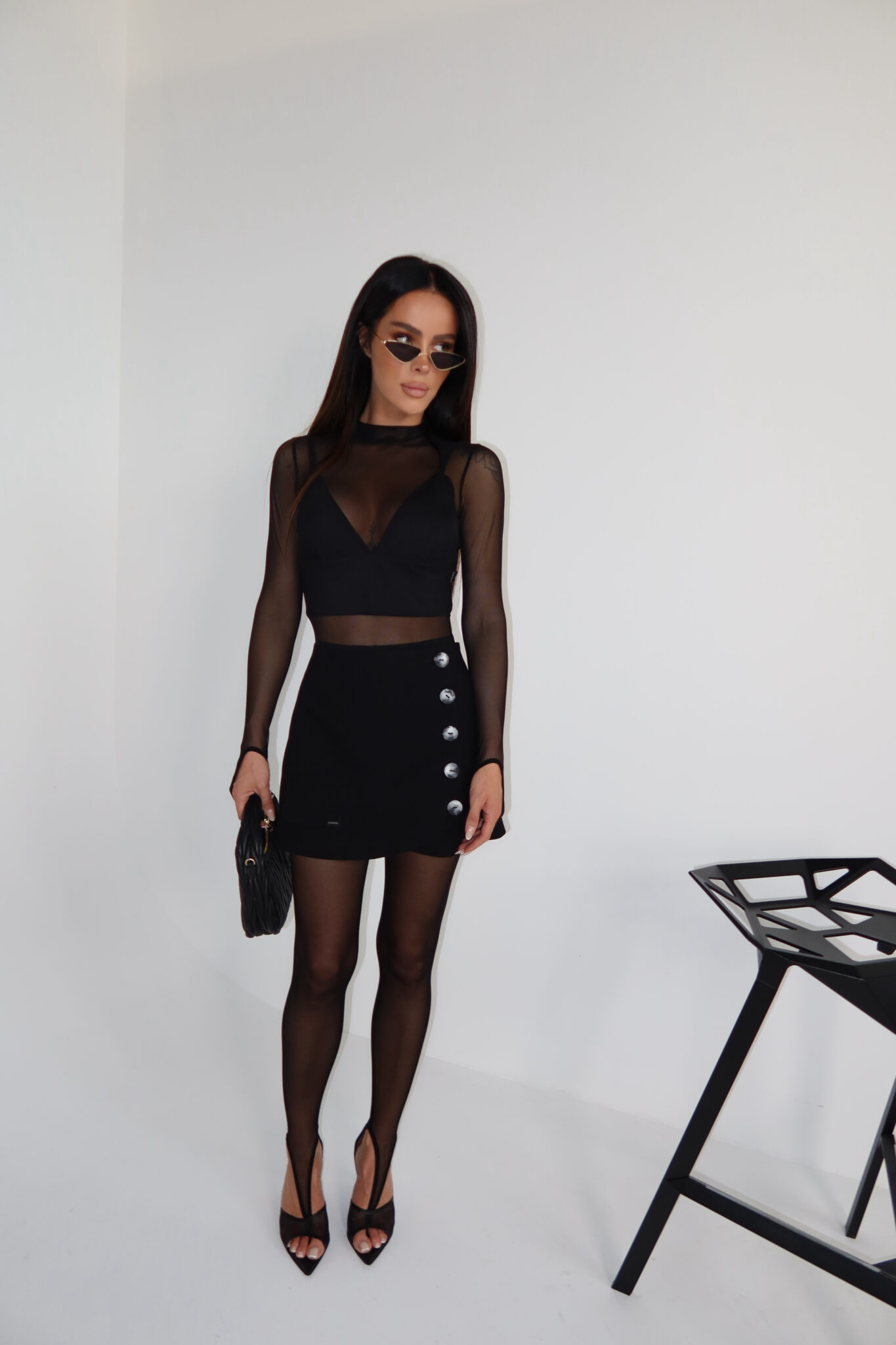 Legginsy wykonane z półtransparentnej, elastycznej siateczki, która delikatnie opina ciało i podkreśla nogi. Materiał lekki, oddychający, z subtelnym połyskiem – idealny do warstwowych stylizacji lub jako efektowny akcent solo. Wysoki stan i elastyczna talia zapewniają komfort noszenia, a dopasowany krój wydłuża sylwetkę. Must-have dla fanek odważnych, fashion-forward looków.Skład: 95% poliester 5% elastan