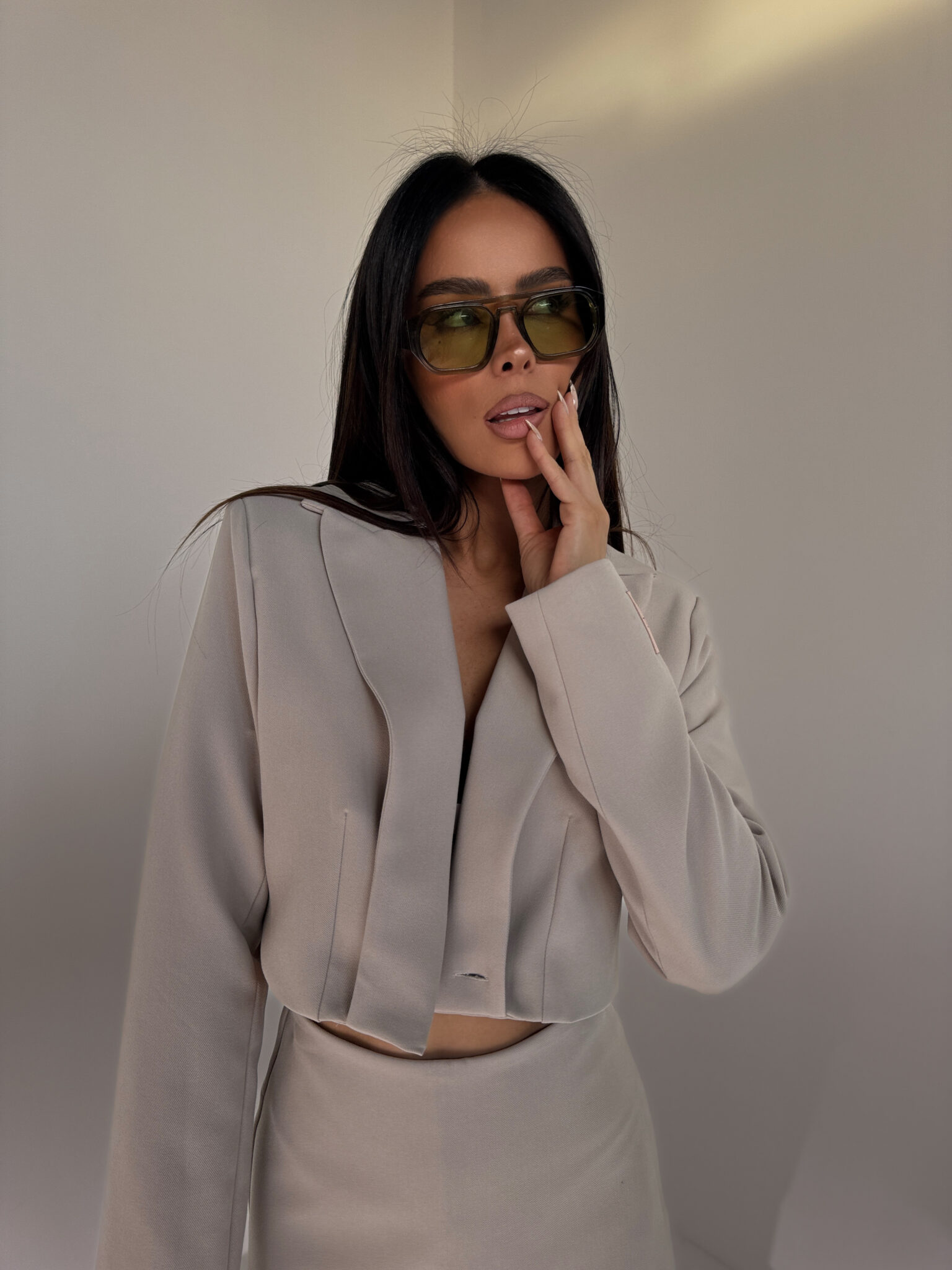 Krótka marynarka o nowoczesnym, pudełkowym kroju. Posiada głęboki dekolt, klasyczny kołnierz oraz długie rękawy zakończone metką z logo. Idealny do stylizacji wieczorowych i codziennych. Świetnie prezentuje się zarówno solo, jak i w komplecie z szortami.Skład: 80% poliester 15% rayon 5% spandex