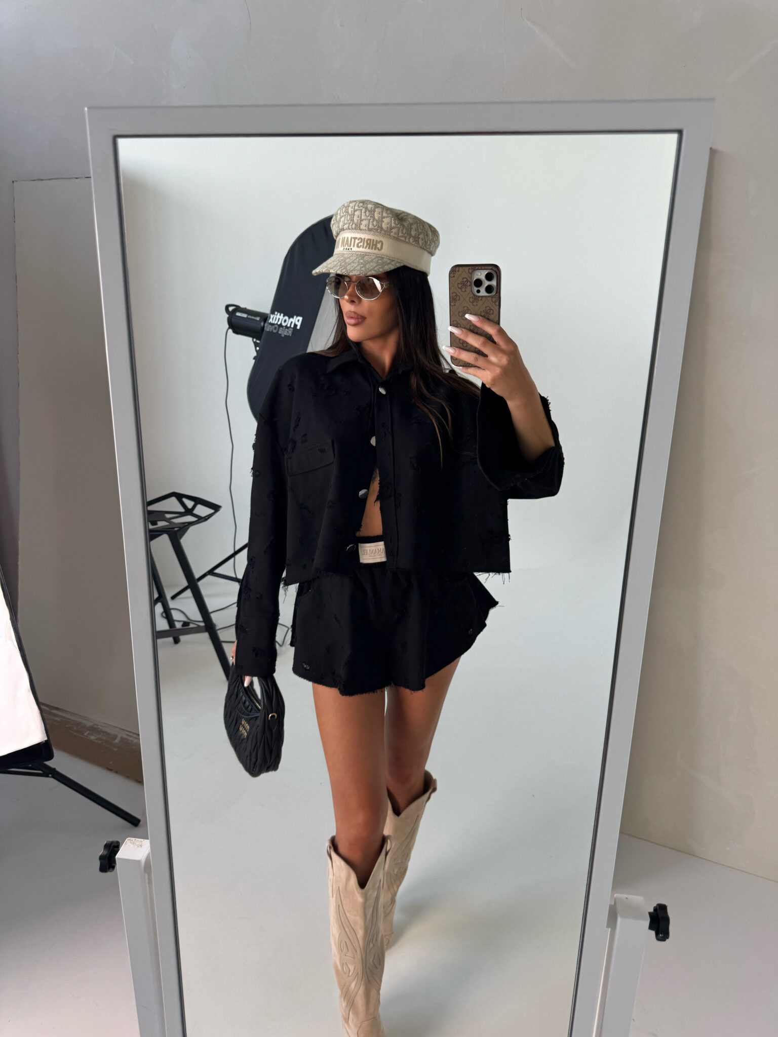 Casualowe szorty z elastycznym pasem, które łączą wygodę z wyrazistym charakterem. Wykonane z miękkiego, ale trwałego denimu z nieregularnymi przetarciami i postarzanym wykończeniem. Surowo cięty dół dodaje lekkości i swobody, a tylna naszywka z logo LAMANUEL podkreśla ich charakter premium. Idealne do letnich stylizacji – zarówno solo, jak i jako część zestawu z kurtką z tej samej tkaniny.Skład: 100% bawełna