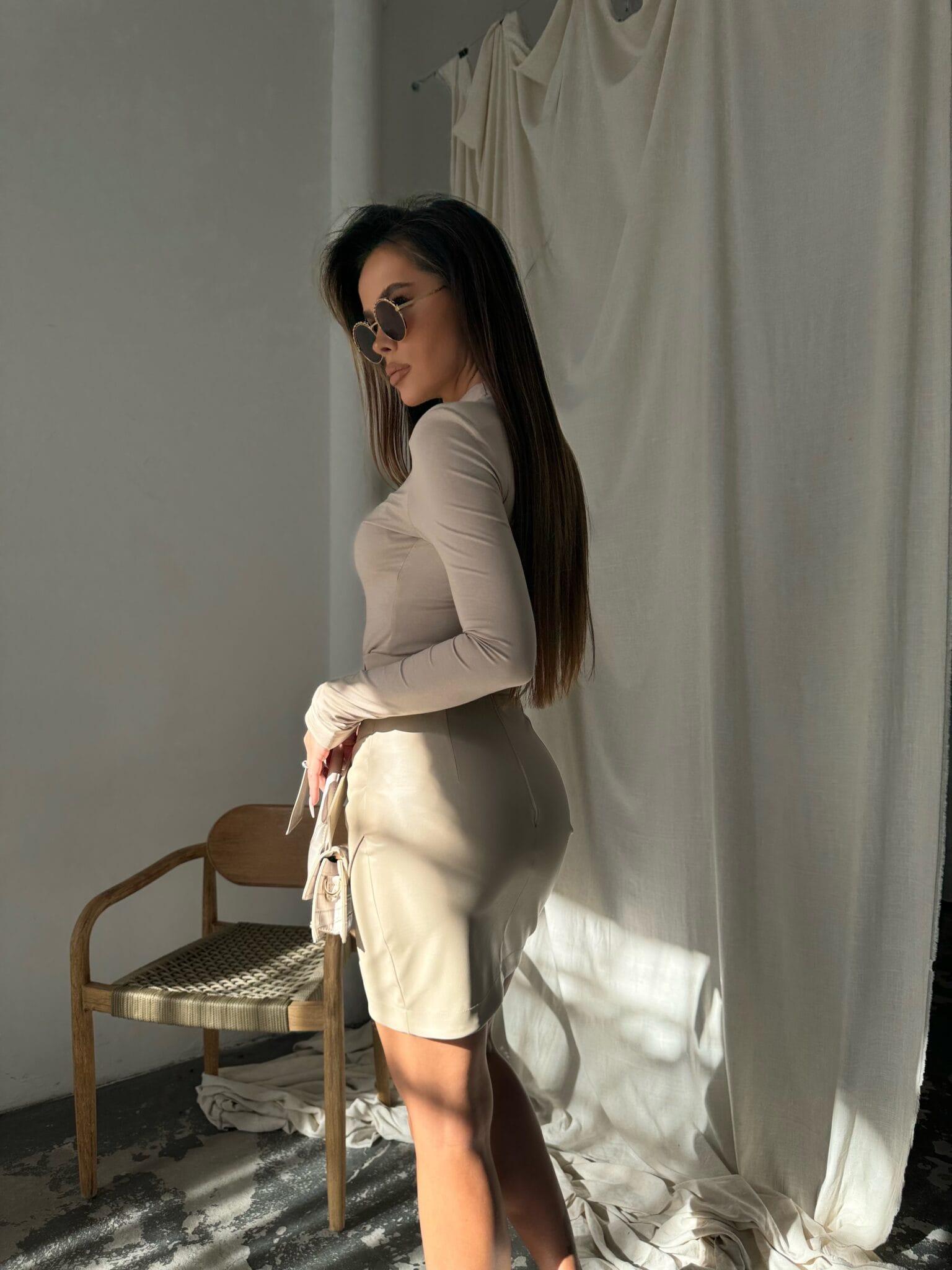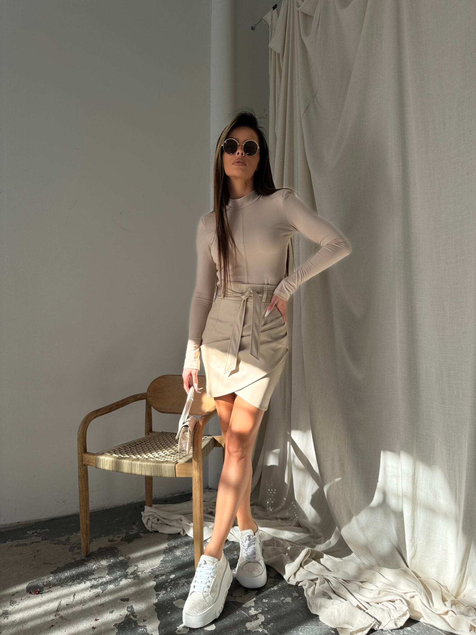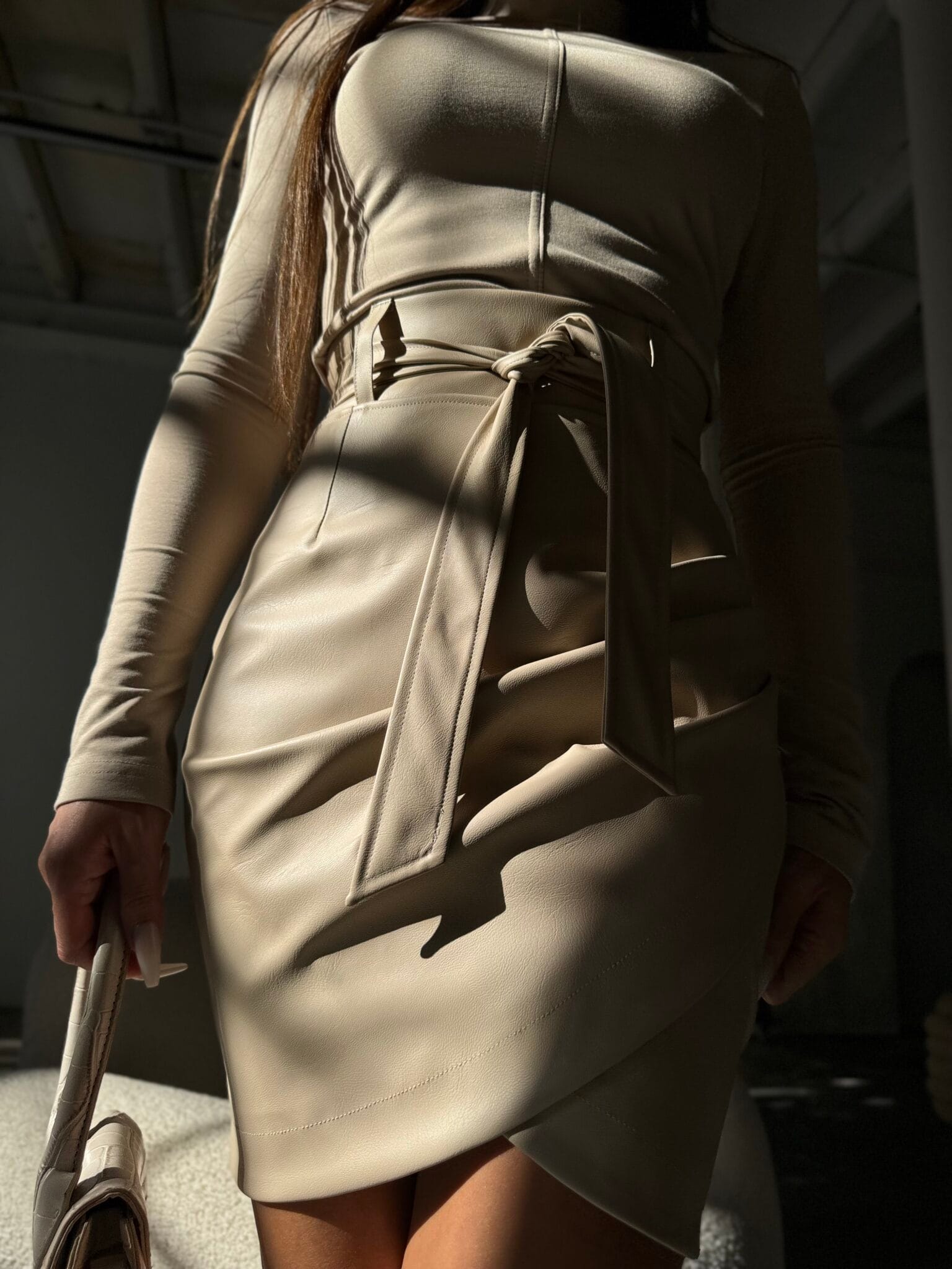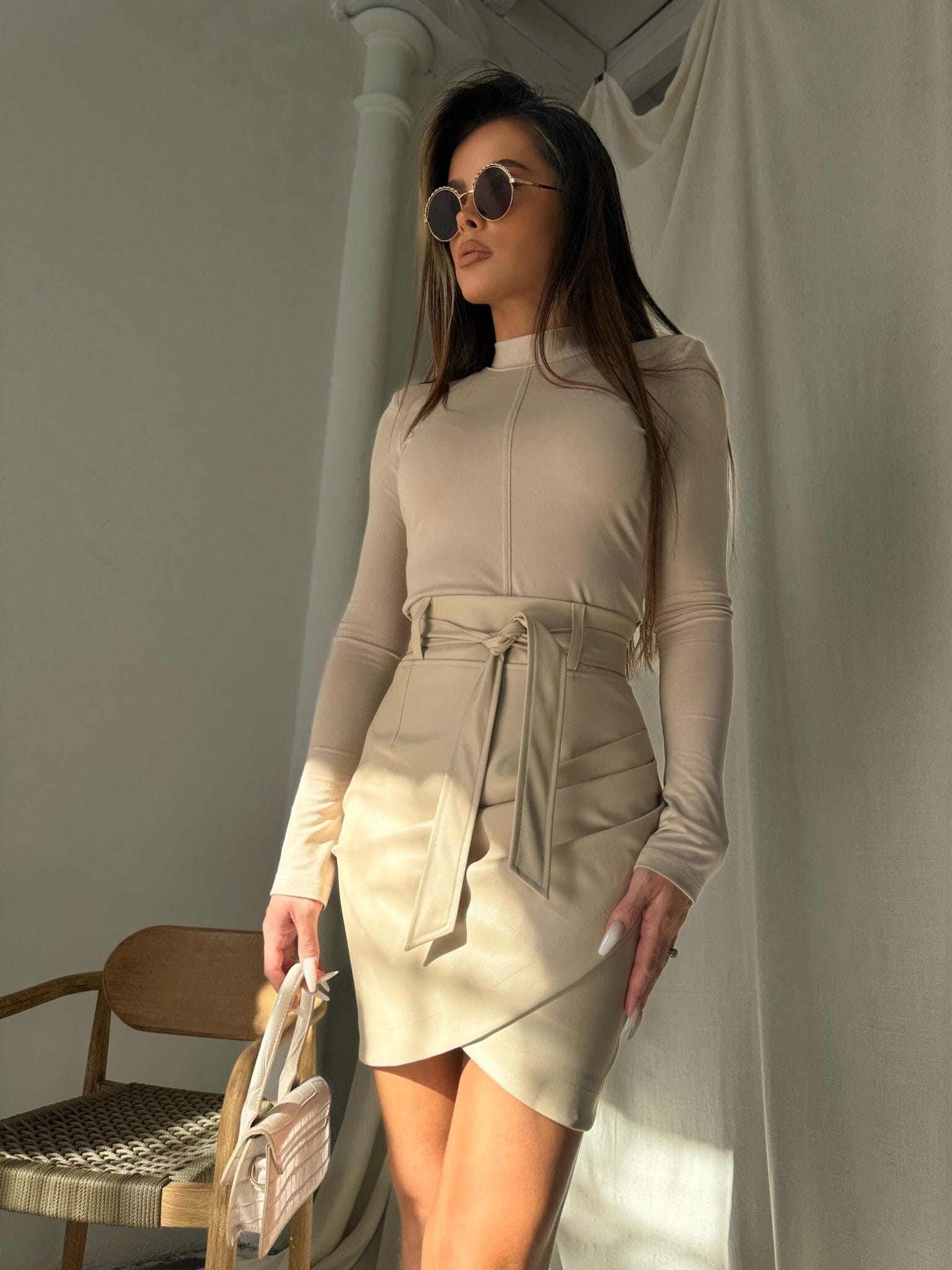 Spódnica z eko skóry o kopertowym kroju midi to elegancki wybór z nutą nowoczesności. Wykonana z wysokiej jakości skóry ekologicznej, zachwyca swoim wyrafinowanym wyglądem. Pasek dodaje wyrazistości i podkreśla talię, a kopertowy krój zapewnia efektowne ułożenie materiału. Idealna zarówno do formalnych, jak i casualowych stylizacji, łączy w sobie modę i funkcjonalność.Skład: 95% poliester 5% elastan