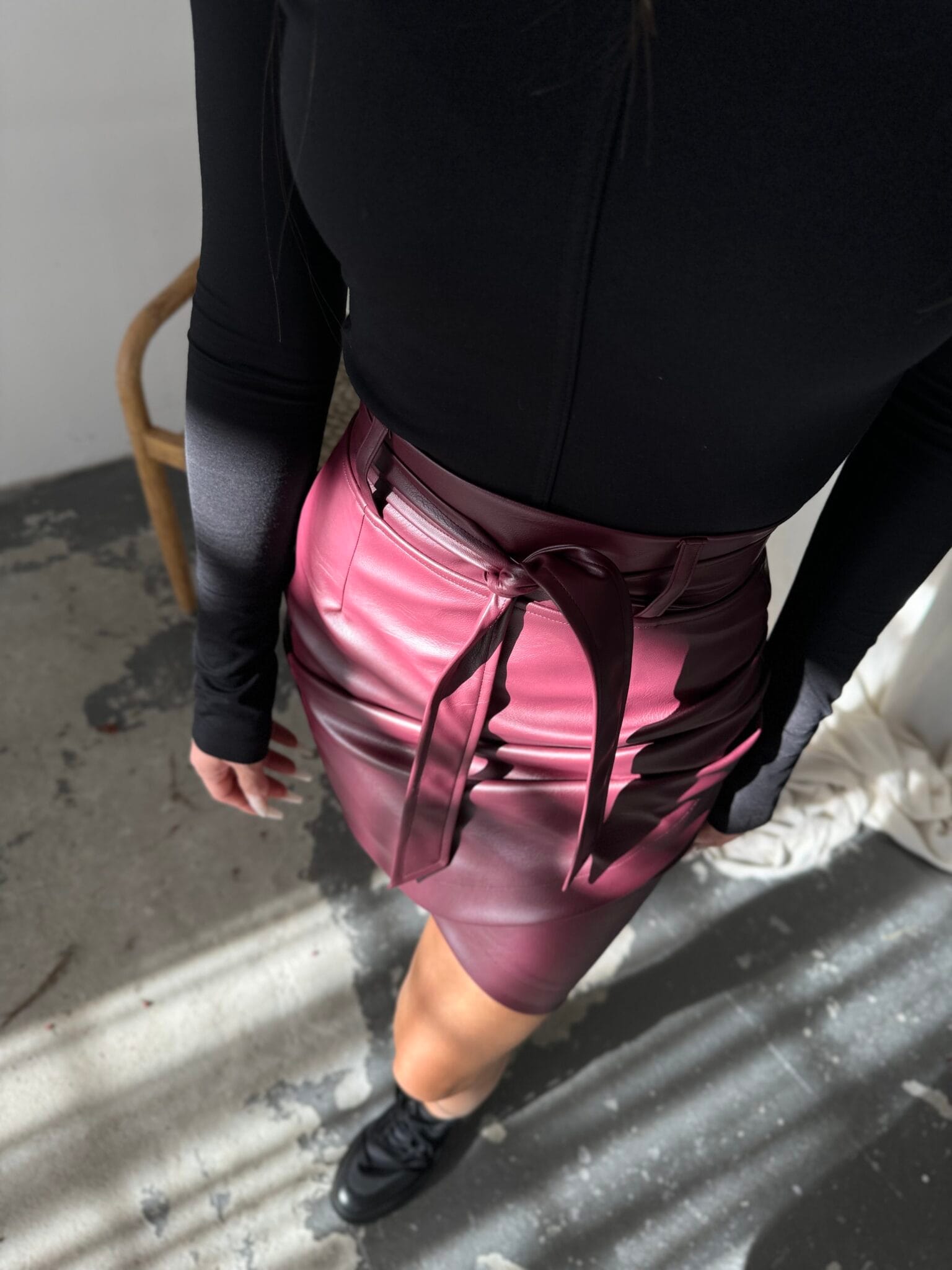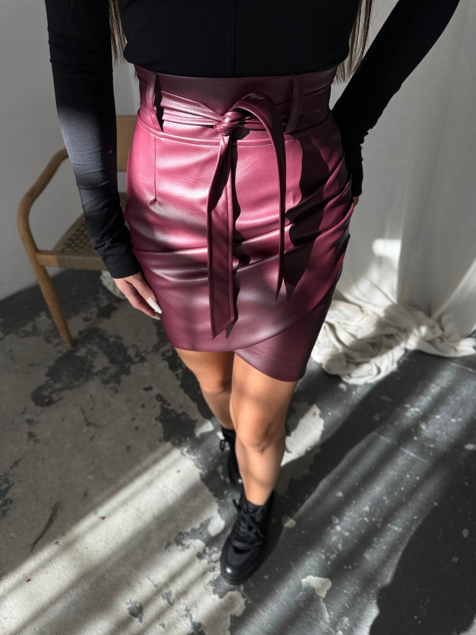 Spódnica z eko skóry o kopertowym kroju midi to elegancki wybór z nutą nowoczesności. Wykonana z wysokiej jakości skóry ekologicznej, zachwyca swoim wyrafinowanym wyglądem. Pasek dodaje wyrazistości i podkreśla talię, a kopertowy krój zapewnia efektowne ułożenie materiału. Idealna zarówno do formalnych, jak i casualowych stylizacji, łączy w sobie modę i funkcjonalność.Skład: 95% poliester 5% elastan