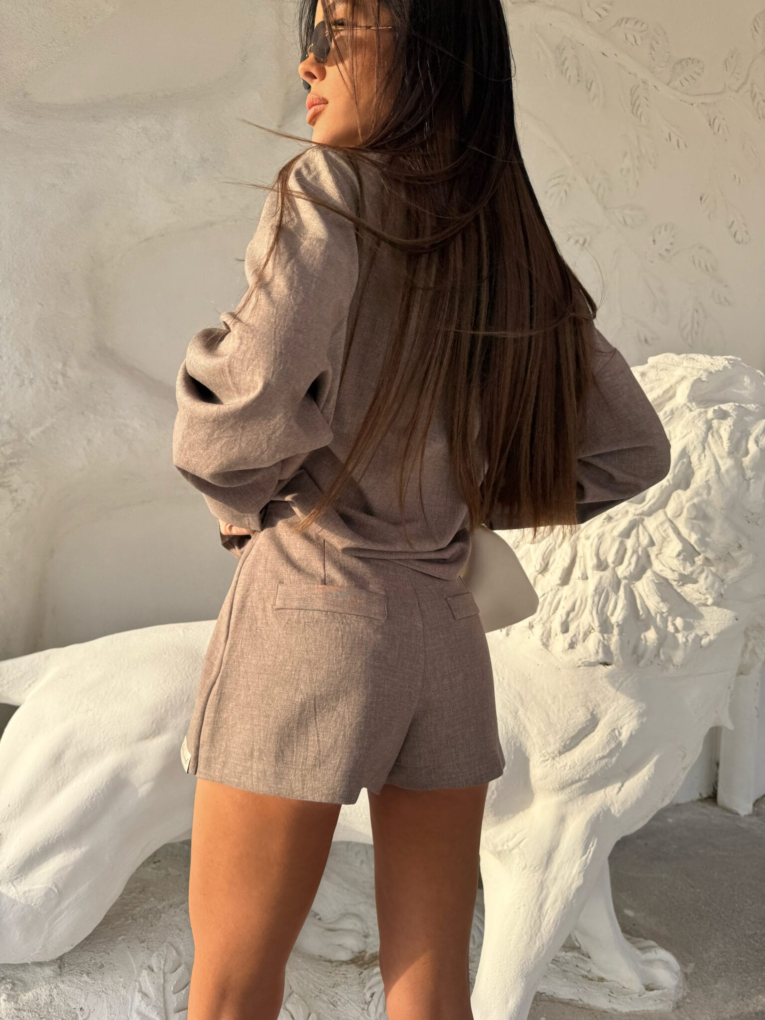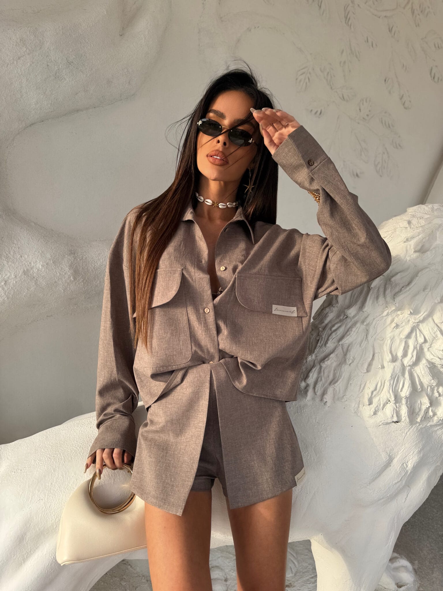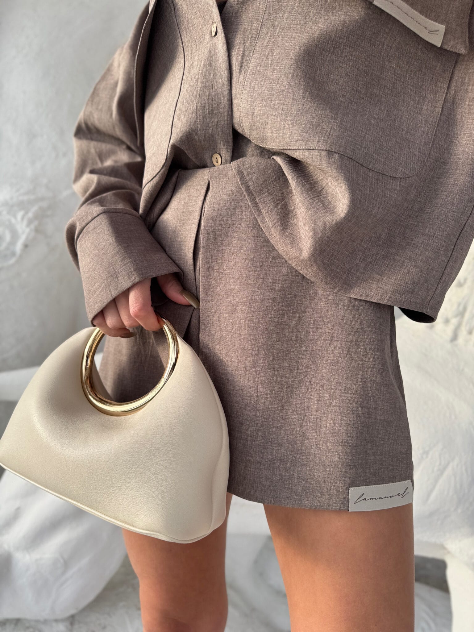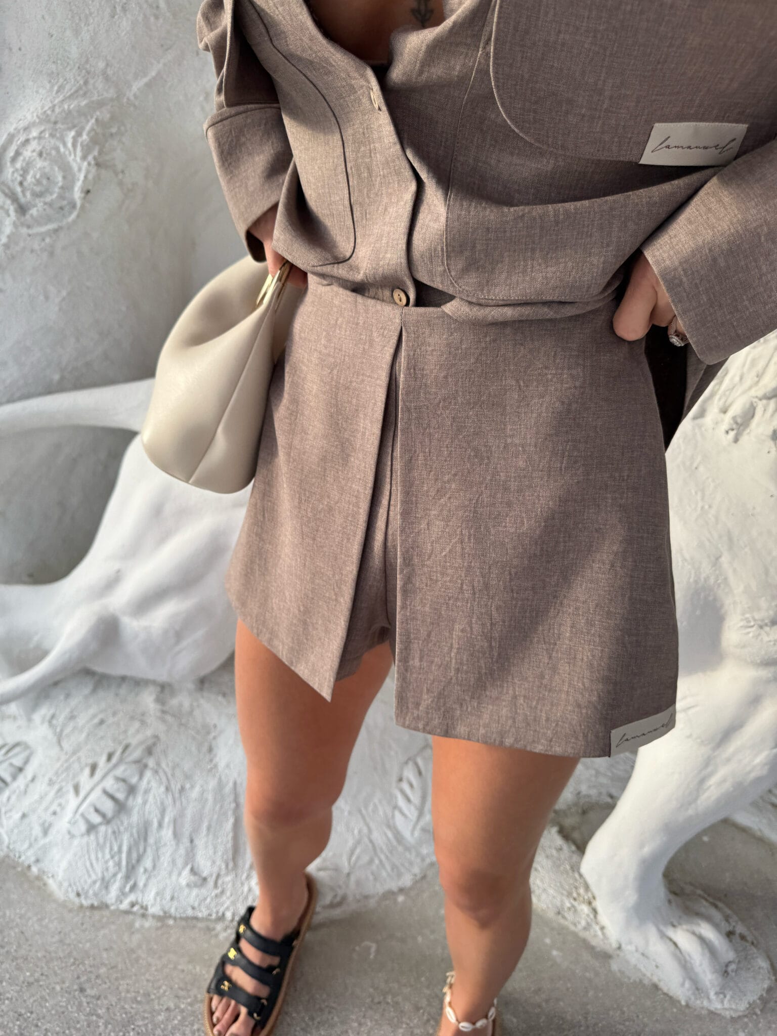 Eleganckie, a zarazem wygodne spódnico-spodenki to must-have w letniej garderobie. Model posiada oryginalne wykończenie z przodu w postaci imitacji spódnicy z zakładką, dzięki czemu łączy kobiecy look z komfortem klasycznych szortów. Uszyte z miękkiej, delikatnie strukturalnej tkaniny, która pięknie układa się na sylwetce. Zapinane z boku na kryty suwak. Wysoki stan podkreśla talię, a minimalistyczna naszywka z logo marki na dole dodaje nowoczesnego akcentu. Świetnie komponują się zarówno z koszulą o niestandardowych kieszeniach z tego samego zestawu, jak i z bardziej casualowym topem.Skład: 100% poliester