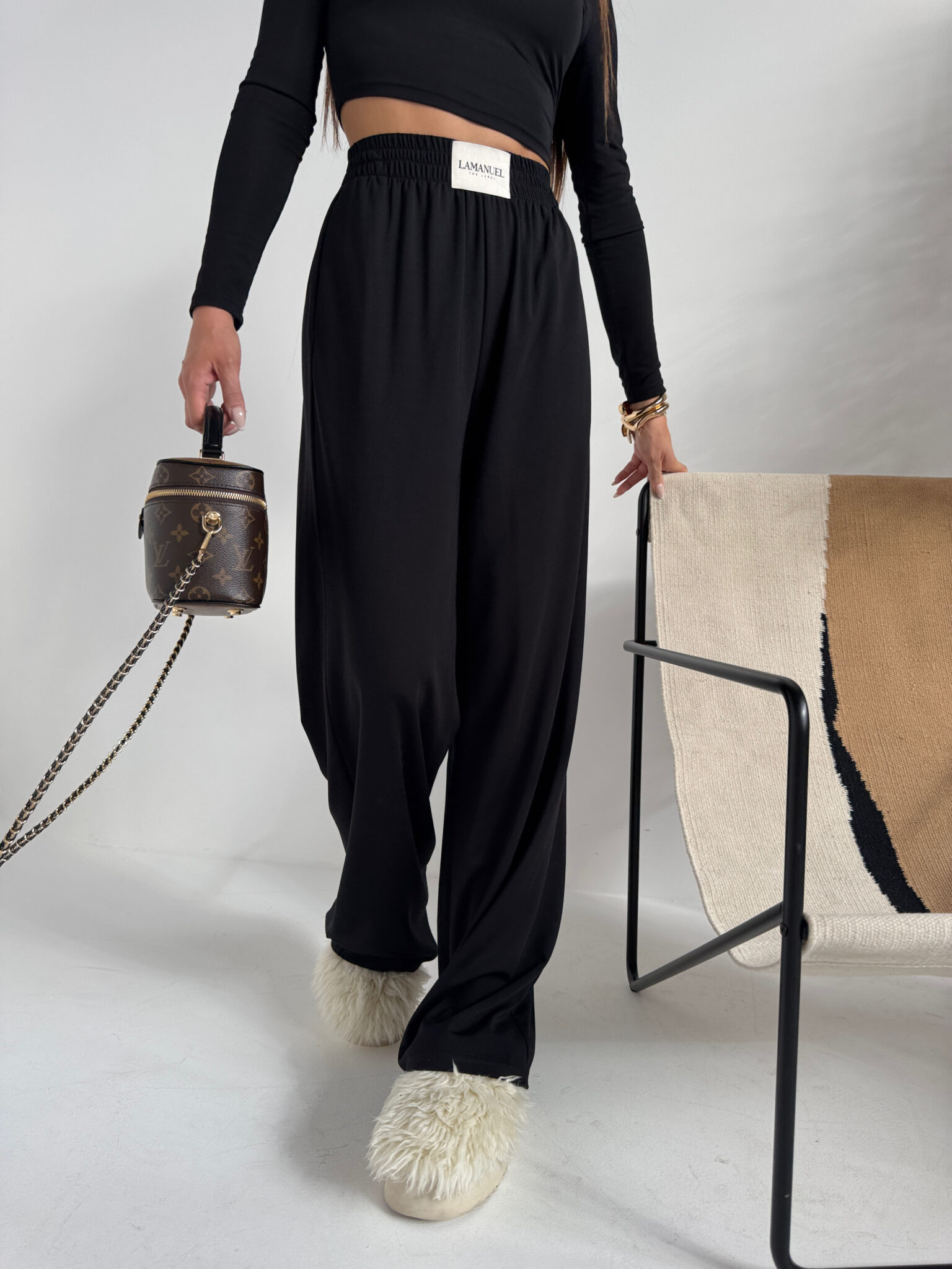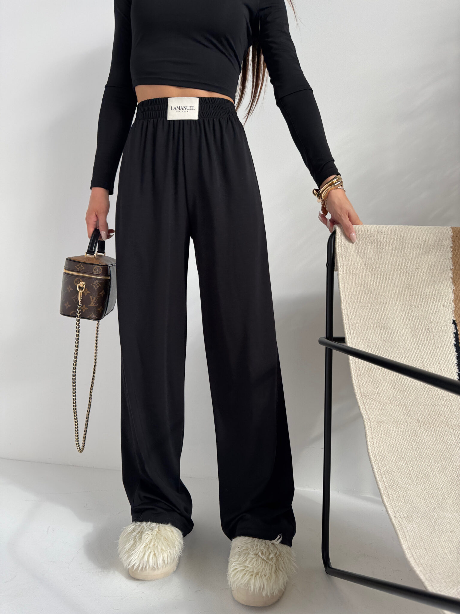 Luźne spodnie z modalu z wysokim, elastycznym stanem wykończonym szeroką gumą i metką z logo. Miękka, lejąca tkanina pięknie układa się na sylwetce i zapewnia pełną swobodę ruchów. Model z kieszeniami. Idealne zarówno do stylizacji domowych, jak i codziennych.Skład: 60% rayon 31% nylon 9% spandex