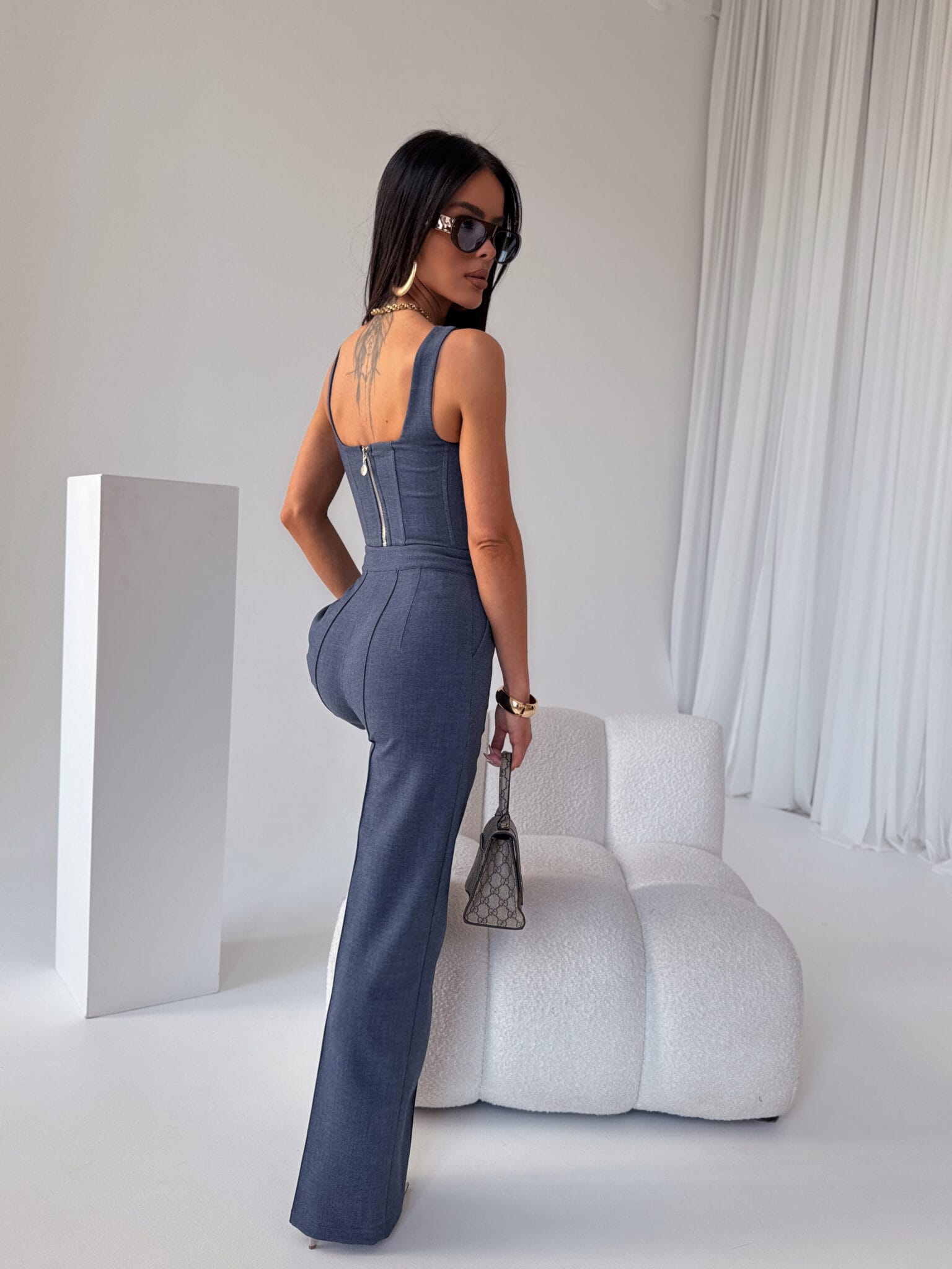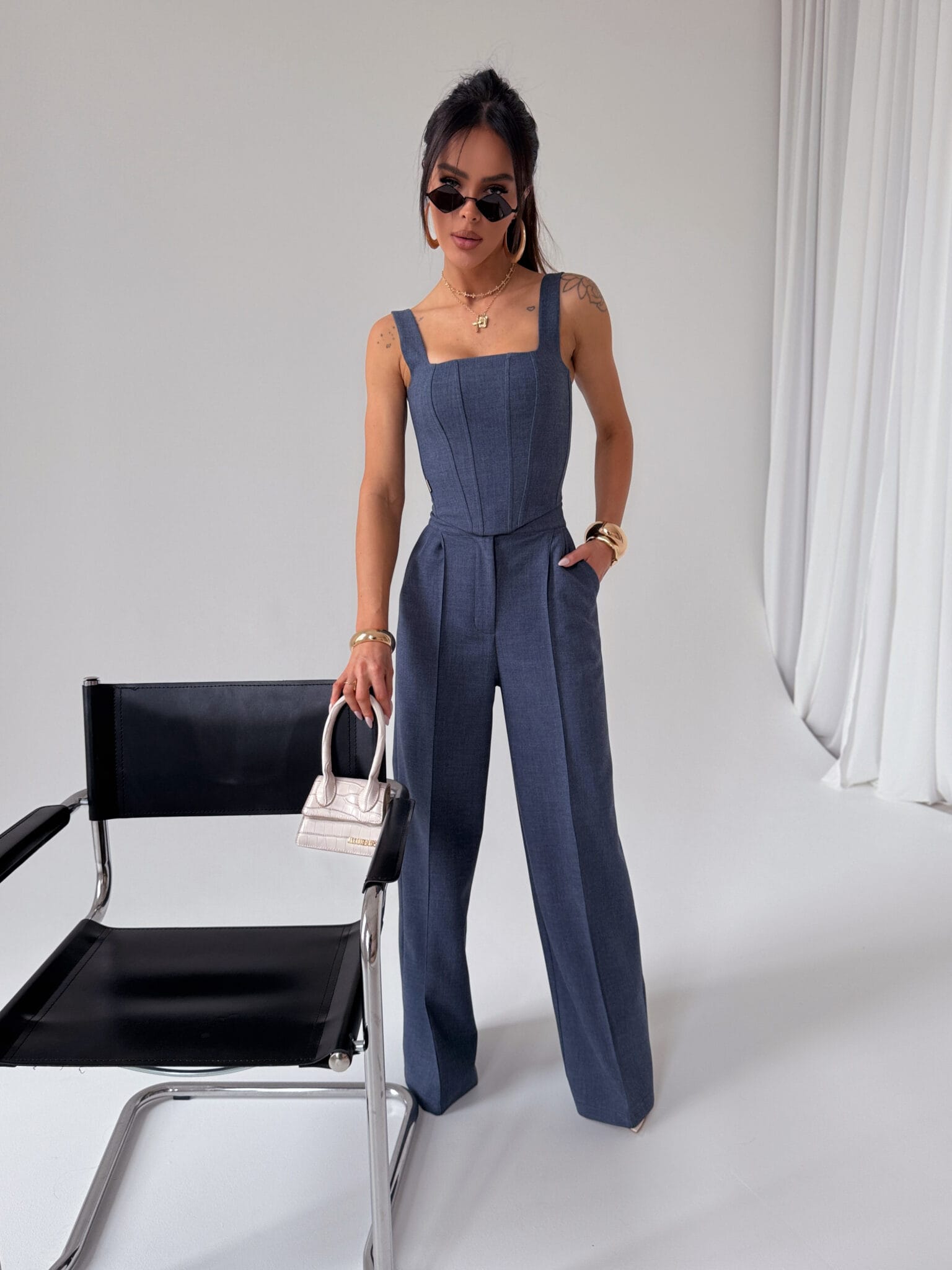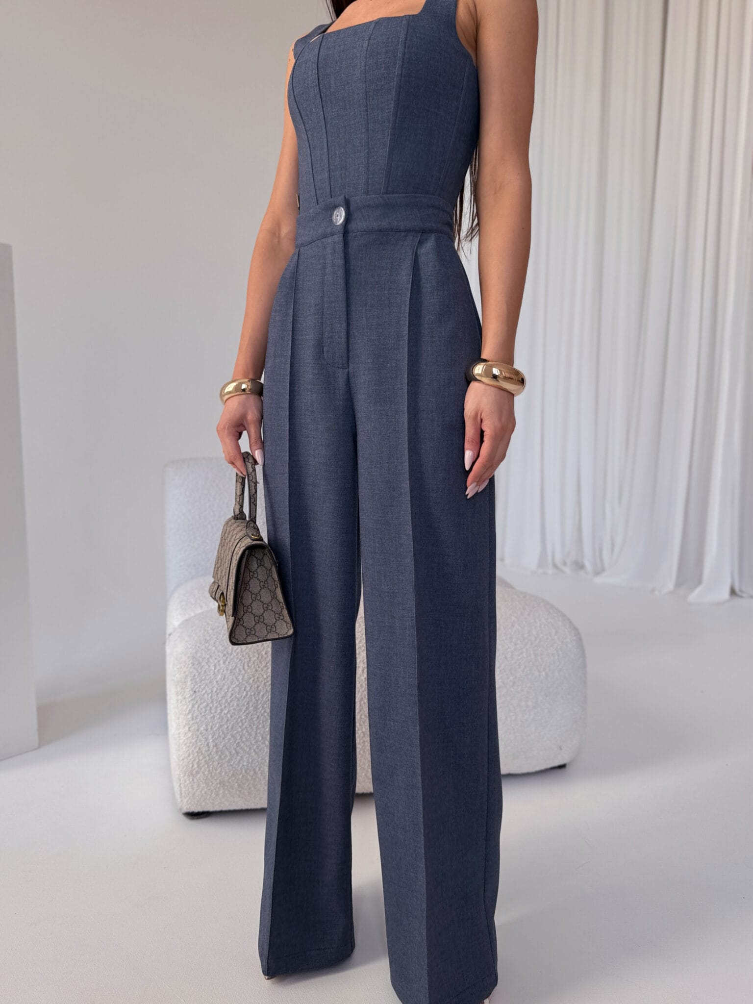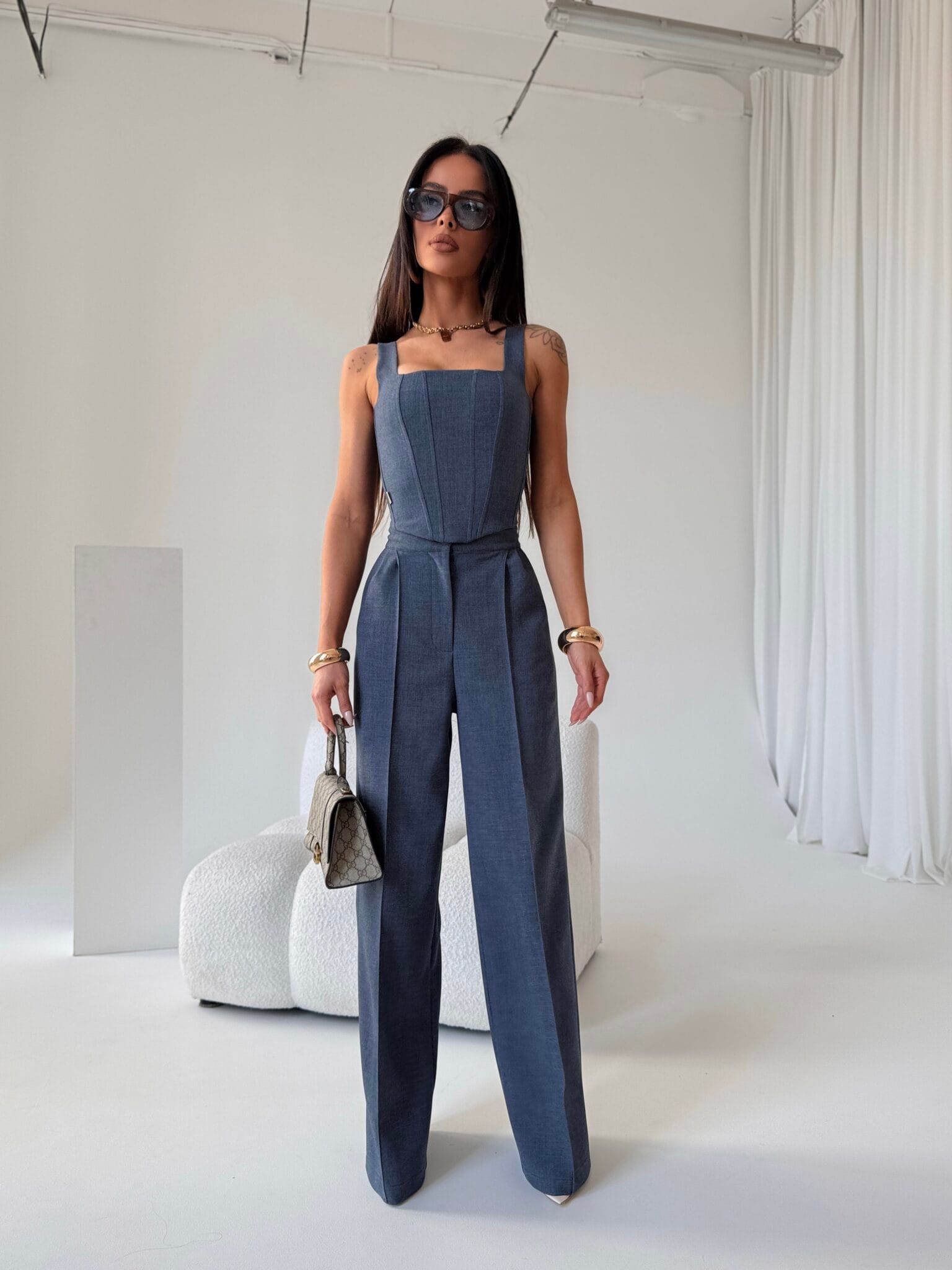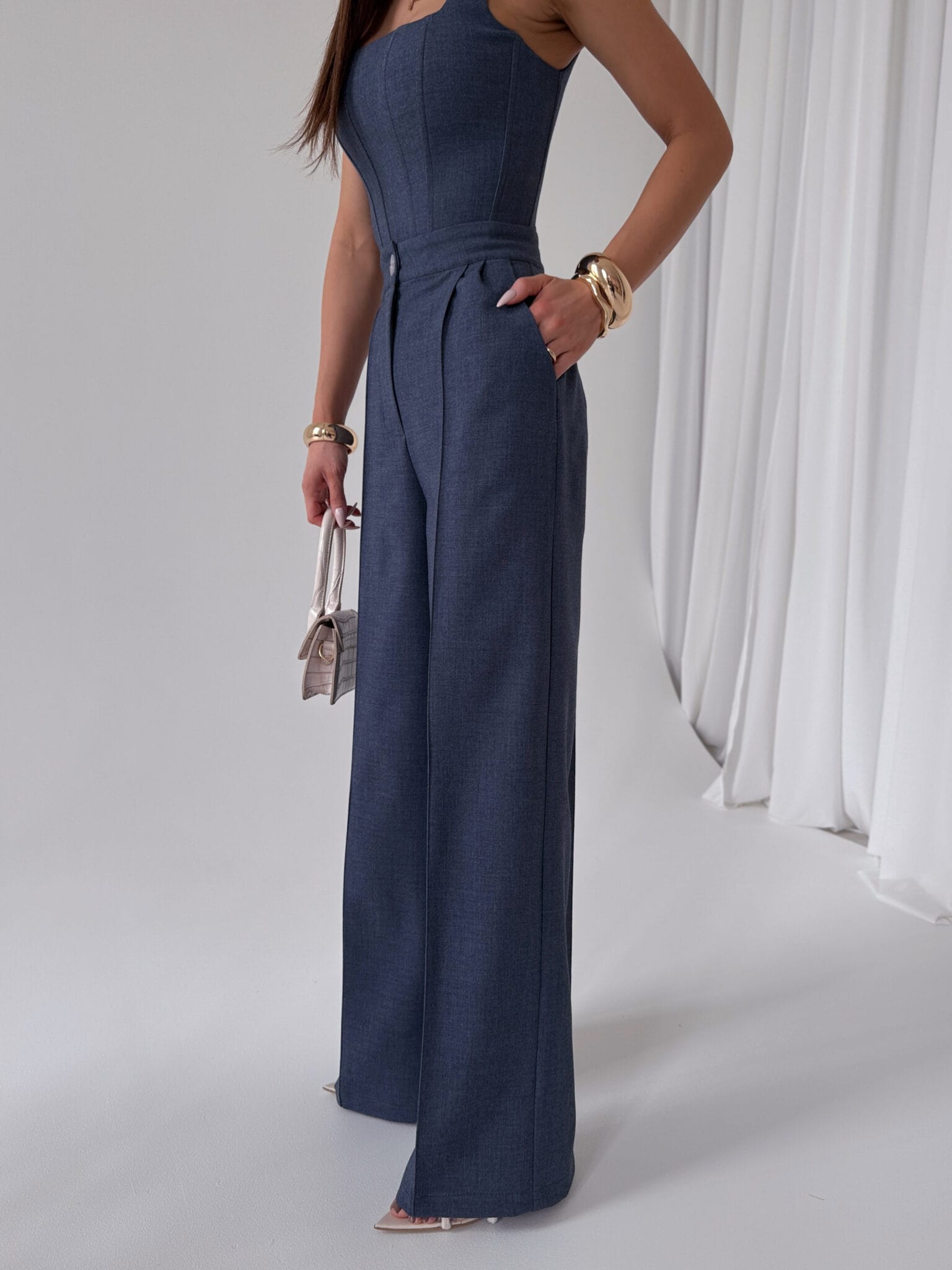 Spodnie o szerokim kroju z wysokim stanem, zapinane na suwak z boku. Wykonane z eleganckiej tkaniny o subtelnej fakturze, która nadaje im strukturalny wygląd. Model z kantem optycznie wydłużającym nogi i delikatnymi zakładkami w talii podkreślającymi sylwetkę. Doskonale sprawdzą się zarówno w klasycznych, jak i nowoczesnych stylizacjach, łącząc komfort z ponadczasową elegancją. Połącz je z naszym gorsetem DYNASTY!Skład: 68% poliester 29% rayon 3% spandex
