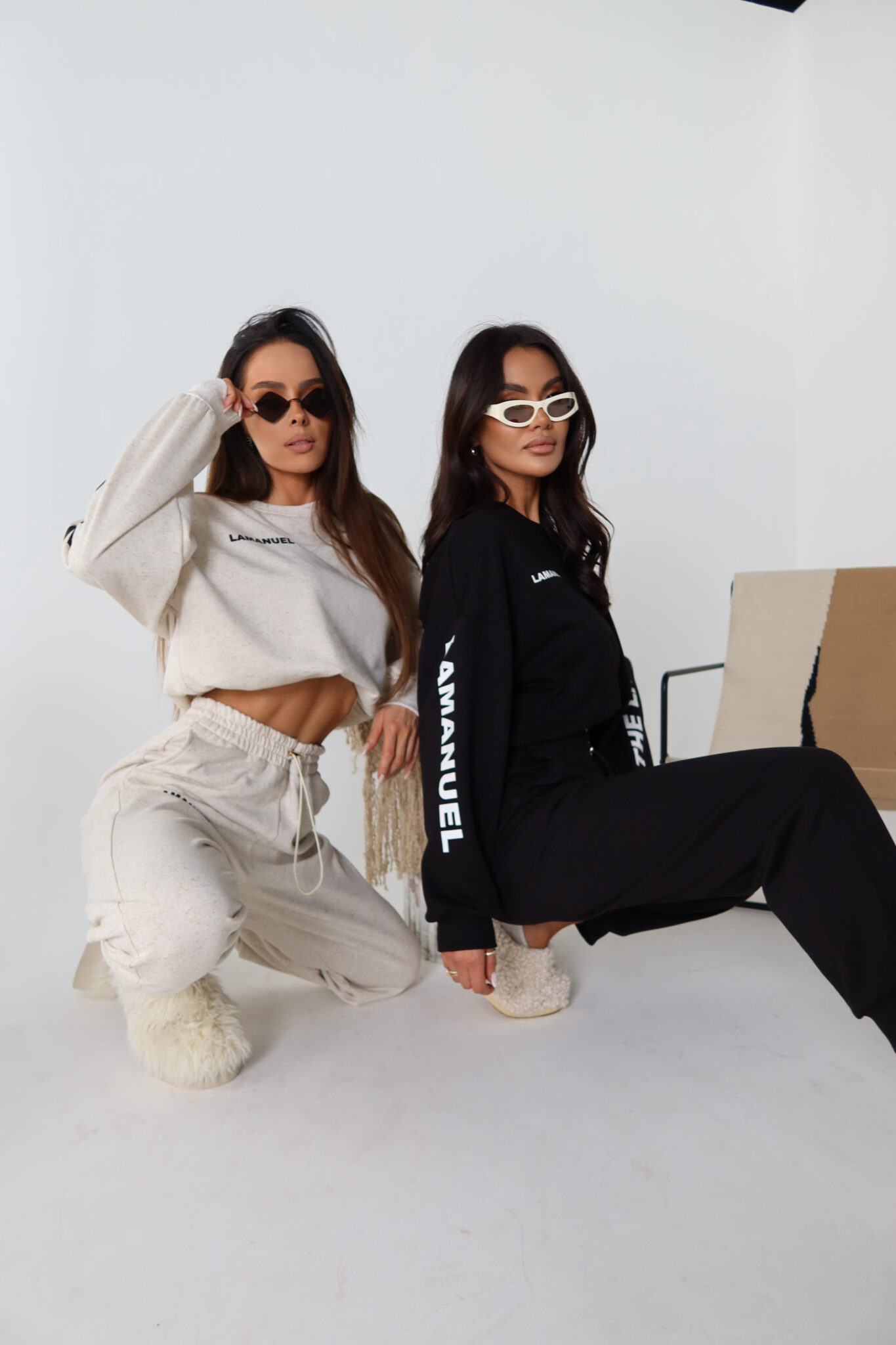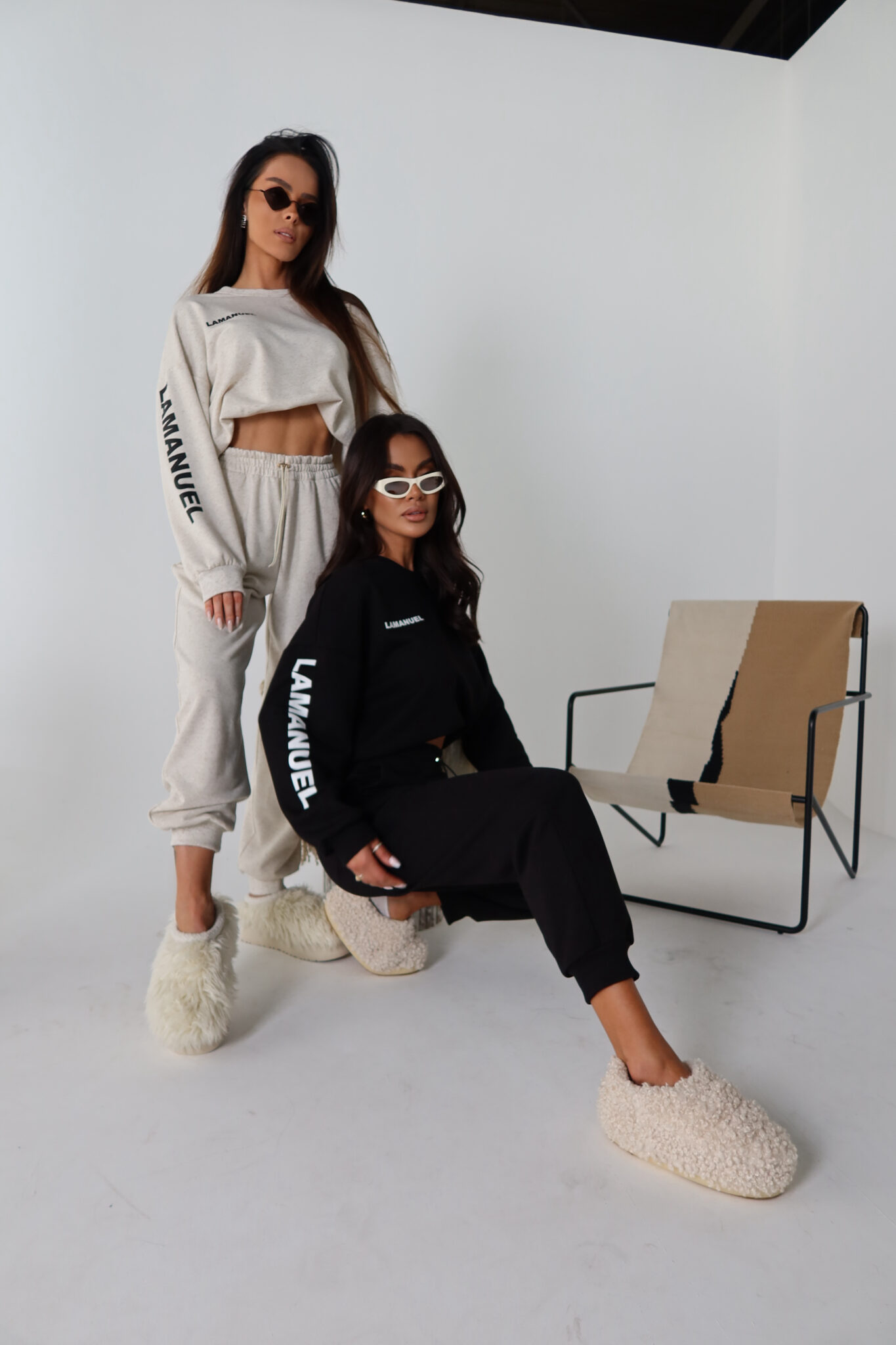 Spodnie dresowe z dzianiny pętelkowej, wysoki stan, elastyczna guma w pasie, ściągacze przy kostkach. Swobodna, lekko zwężana nogawka. Na przodzie subtelny nadruk LAMANUEL. Idealne do bluzy z tej samej linii.Skład: 90% bawełna 10% poliester