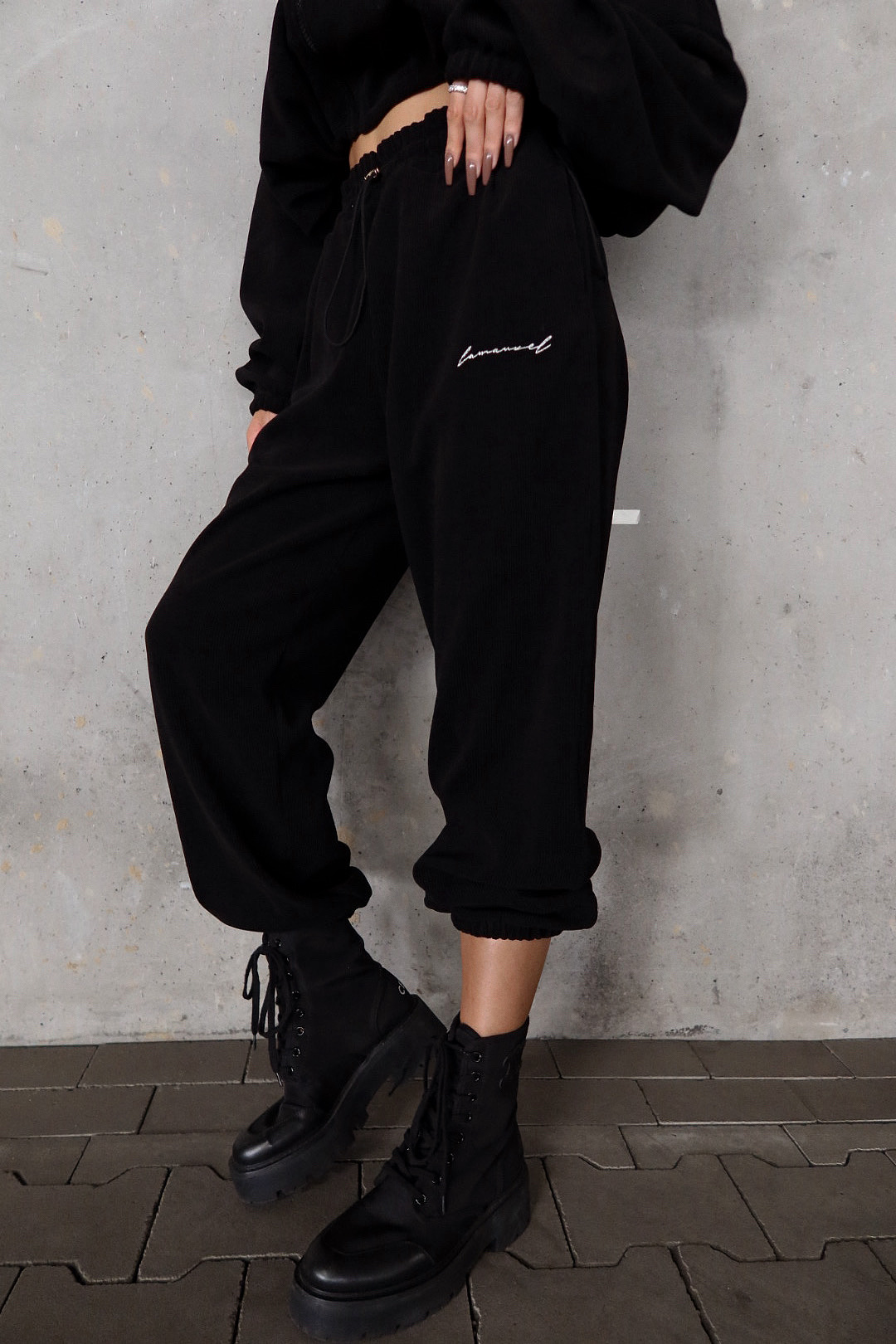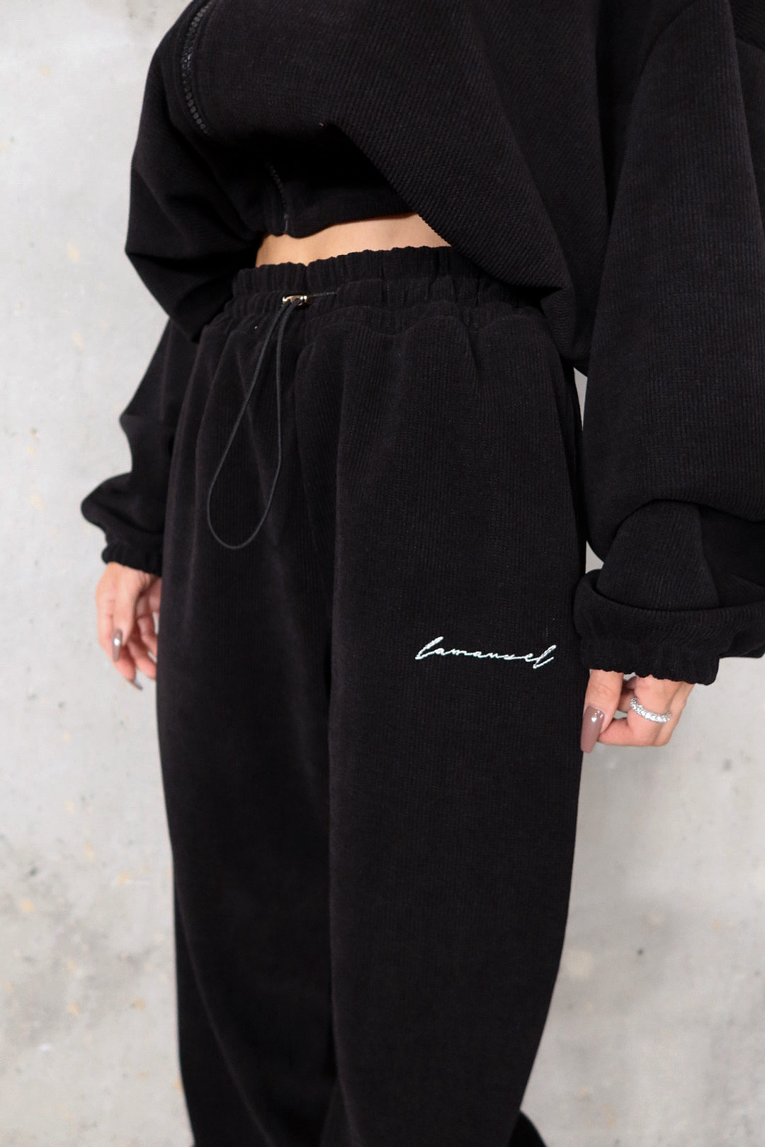 Luźne, welurowe spodnie dresowe o prostym kroju i elastycznej talii ze sznurkiem do regulacji. Prążkowana struktura materiału nadaje im nieoczywistego wyrazu, a haftowane logo przy kieszeni dodaje jakościowego akcentu. Komfortowe, a jednocześnie stylowe – idealne na co dzień i do zestawów z bluzą.Skład: 95% poliester 5% elastan
