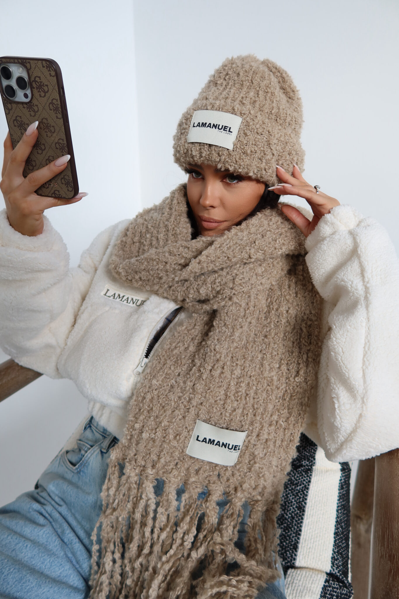 Mięsisty szalik z grubym splotem i długimi frędzlami. Wyróżnia się charakterystyczną fakturą i widoczną naszywką z logo. Otula szyję i dodaje stylu każdej zimowej stylizacji.Skład: 38% akryl 25% moher 20% wełna 17% poliamid