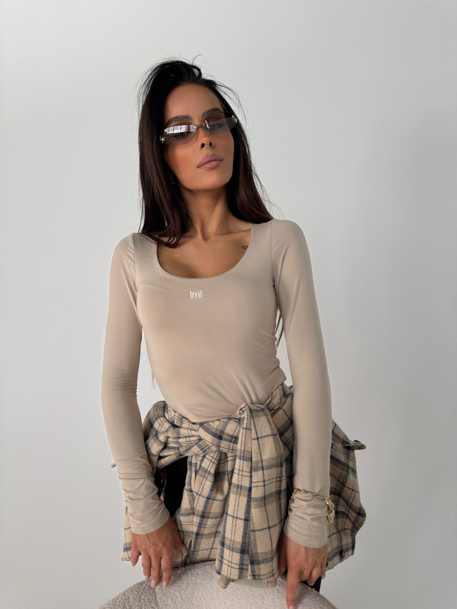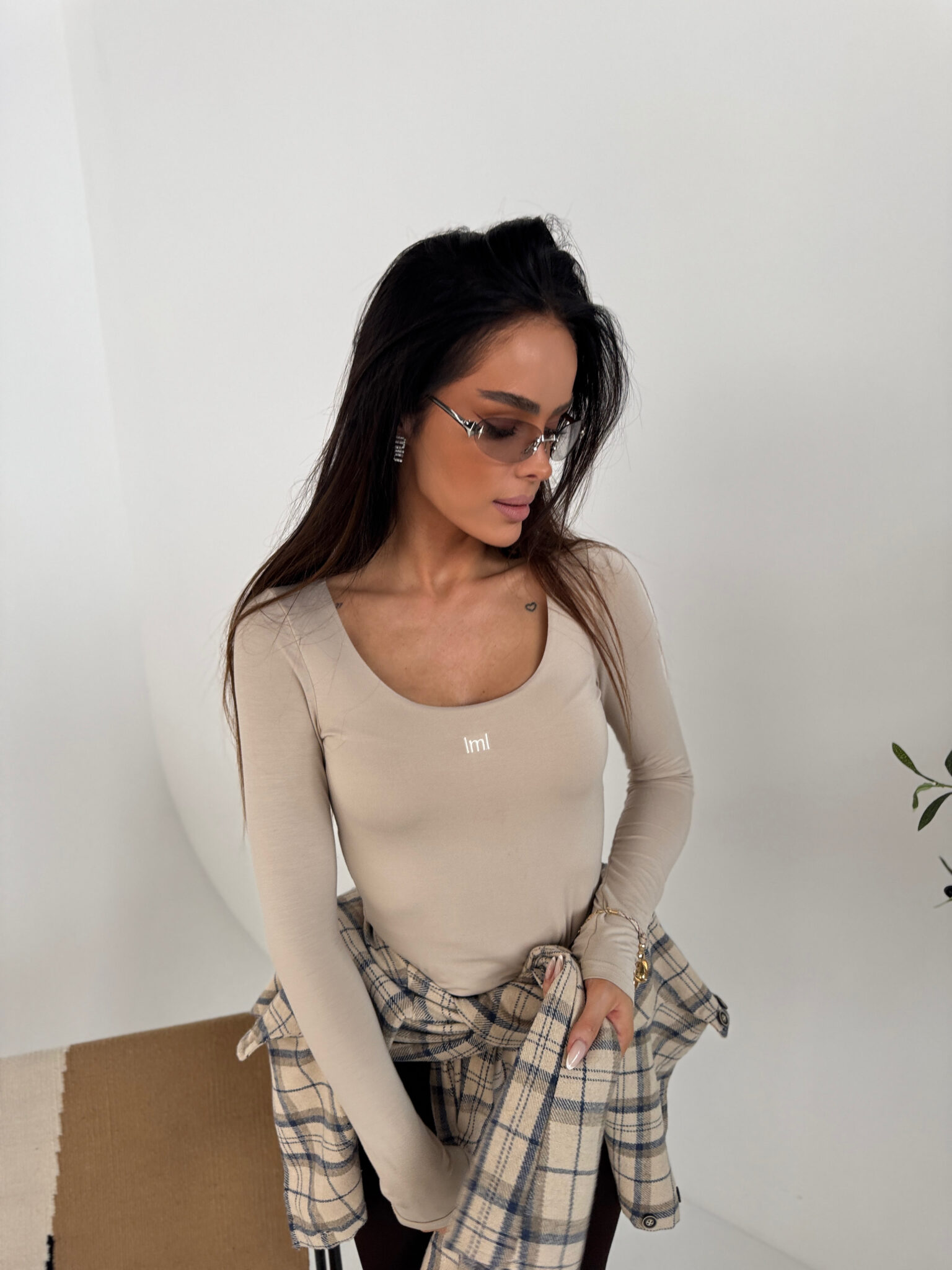 Dopasowany top z długim rękawem i głębokim, zaokrąglonym dekoltem. Wykonany z elastycznej, miękkiej dzianiny, która idealnie przylega do sylwetki. Z przodu drobny haft z logo. Minimalistyczny fason idealny do stylizacji codziennych, sportowych i casualowych.Skład: 95% wiskoza 5% elastan