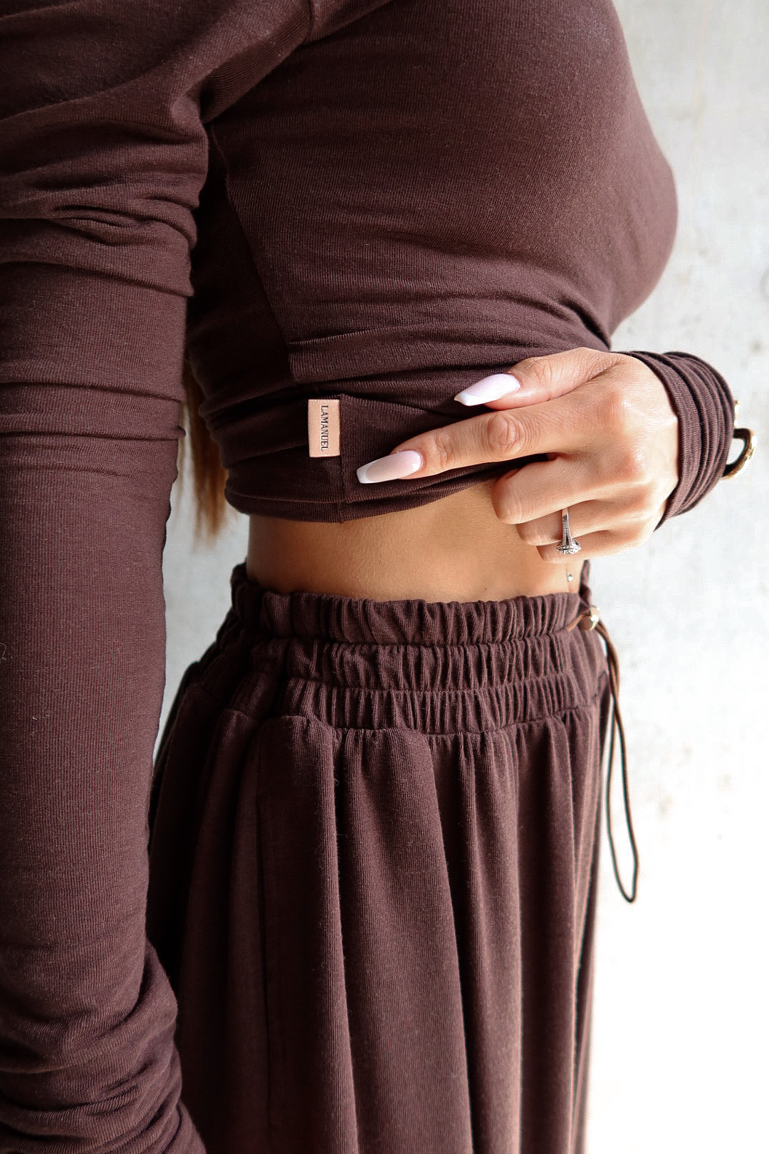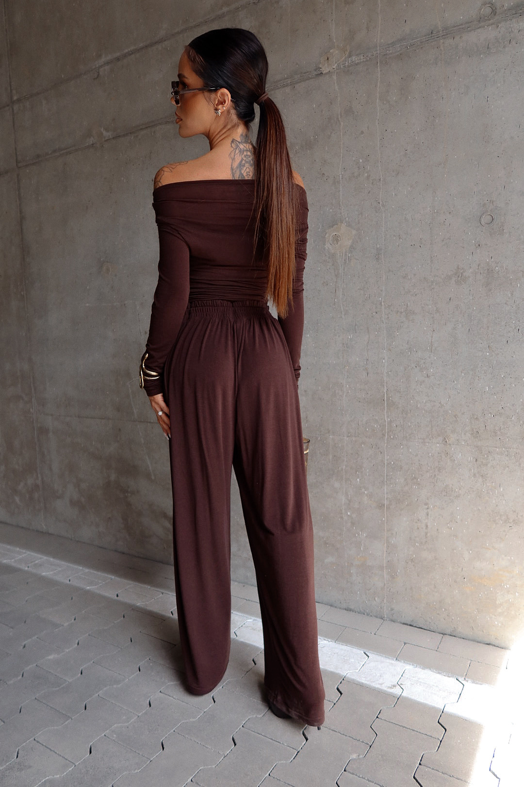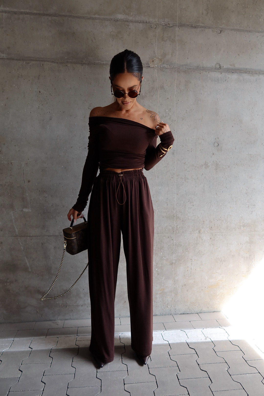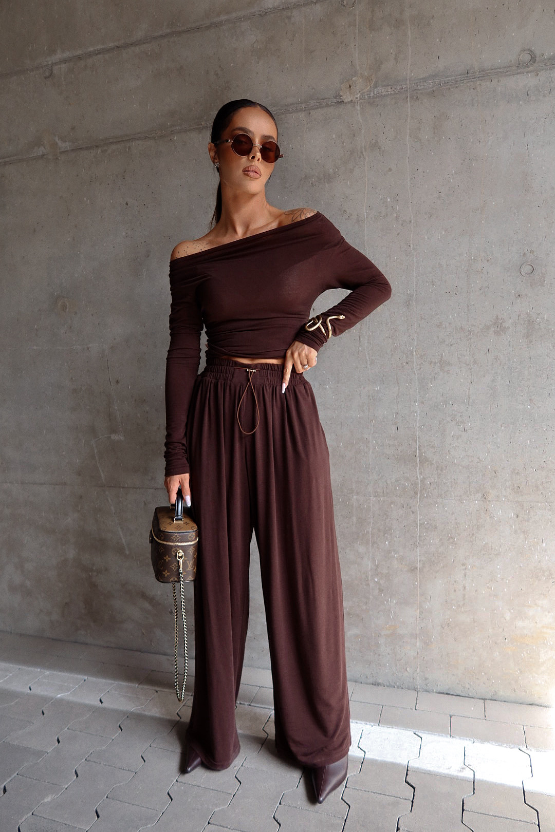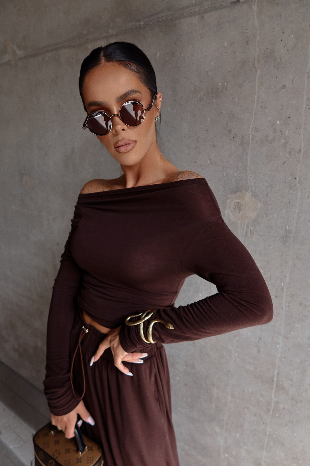 Dopasowany top wykonany z miękkiej, sweterkowej dzianiny o przyjemnej fakturze. Prosty fason z długim rękawem i delikatnie opadającym dekoltem, który pozwala nosić go z odsłoniętym ramieniem. Materiał elastyczny i wygodny, idealnie dopasowuje się do sylwetki. Świetna baza do codziennych, nonszalanckich stylizacji.Skład: 73% tencel 19% wełna 8% spandex