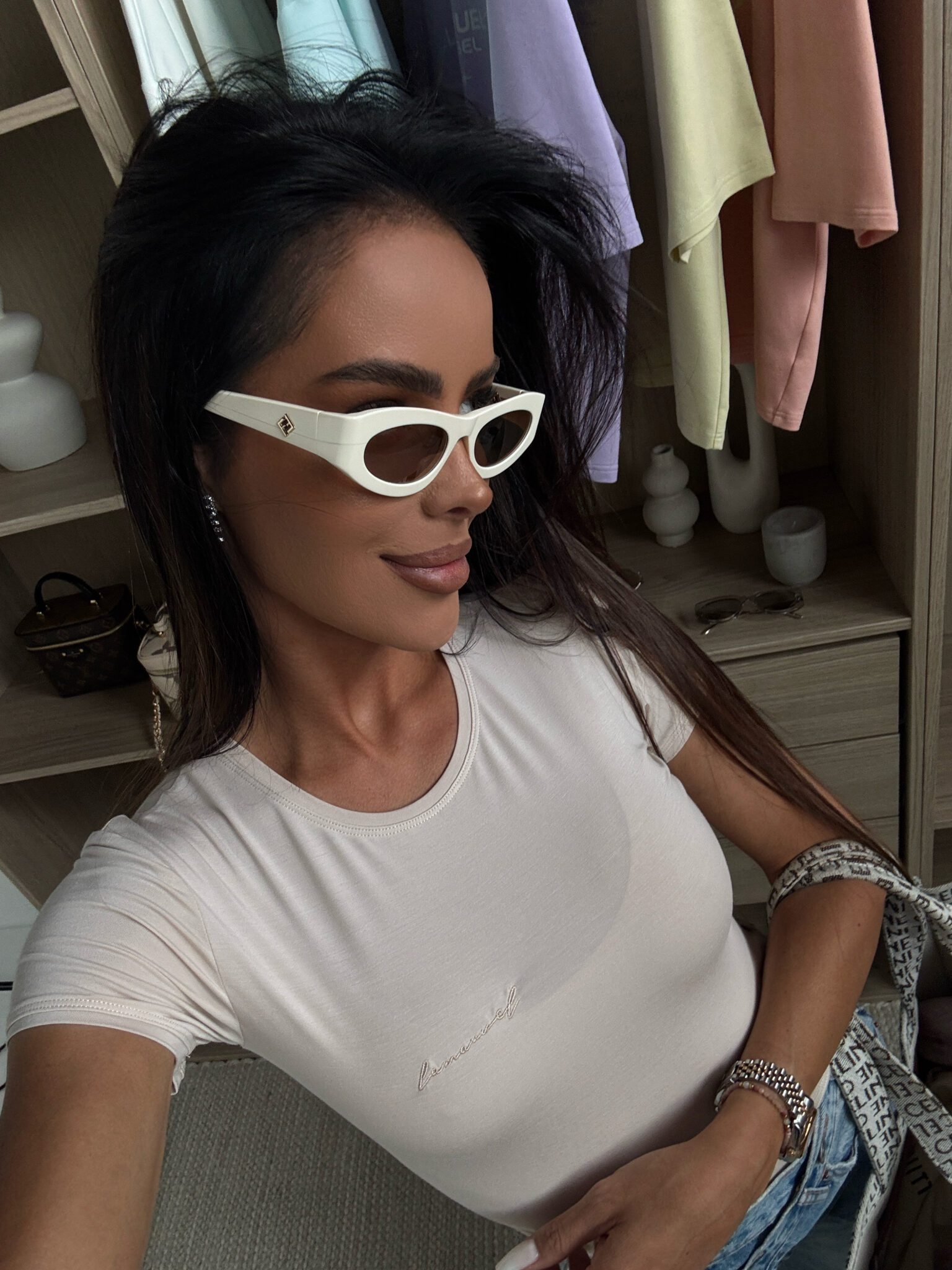 T-shirt o dopasowanym kroju wykonany z elastycznej, gładkiej dzianiny. Na piersi haftowany napis w stylu ręcznego podpisu. Dół oraz rękawy wykończone są w estetyczny sposób przy pomocy wszytej lamówki, stanowiącej oddzielny element materiałowy. Na bocznym szwie znajduje się mała metka typu chorągiewka z charakterystycznym logo w formie litery „M”. Model łączy minimalizm z subtelnymi detalami, nadając całości elegancki i dopracowany wygląd.Skład: 93% wiskoza 7% elastan