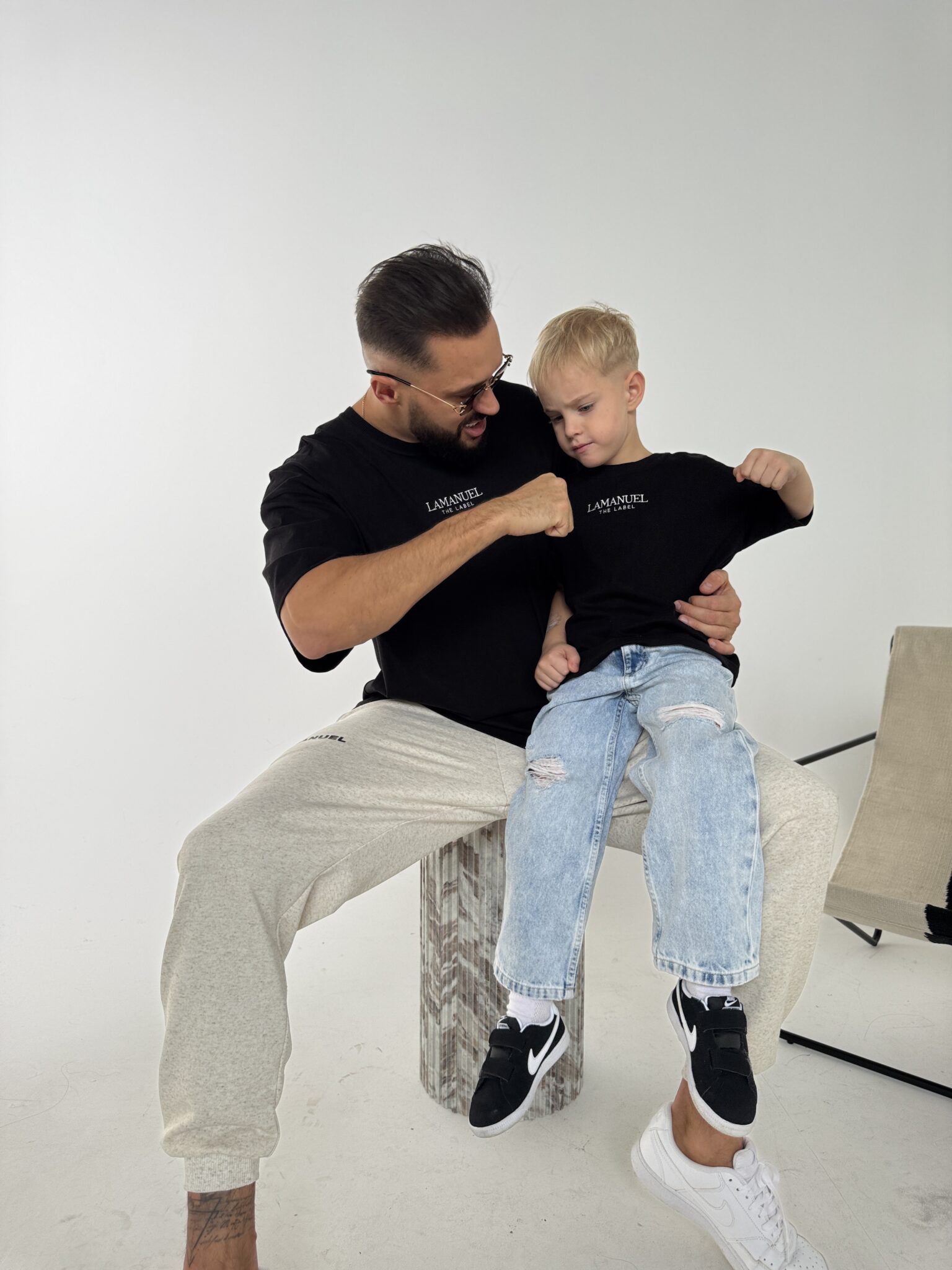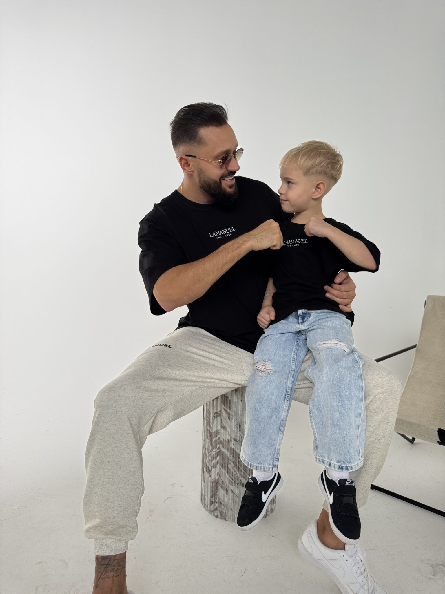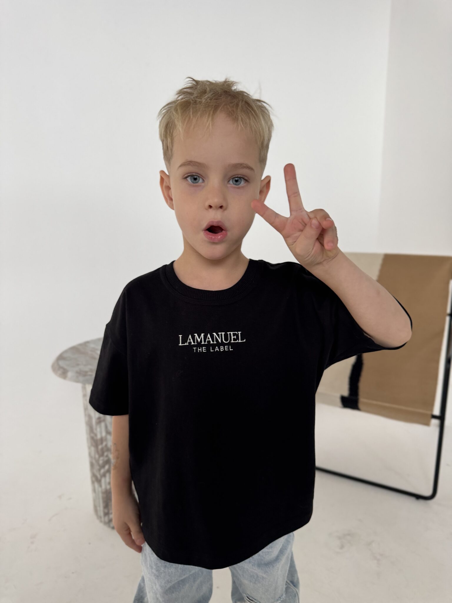 Uroczy t-shirt w stylu oversize, uszyty z przyjemnej w dotyku bawełny. Z przodu haft z logo LAMANUEL – mini wersja dorosłego modelu. Komfortowy i trwały, idealny do zestawu rodzinnego matchy.Skład: 100% bawełna